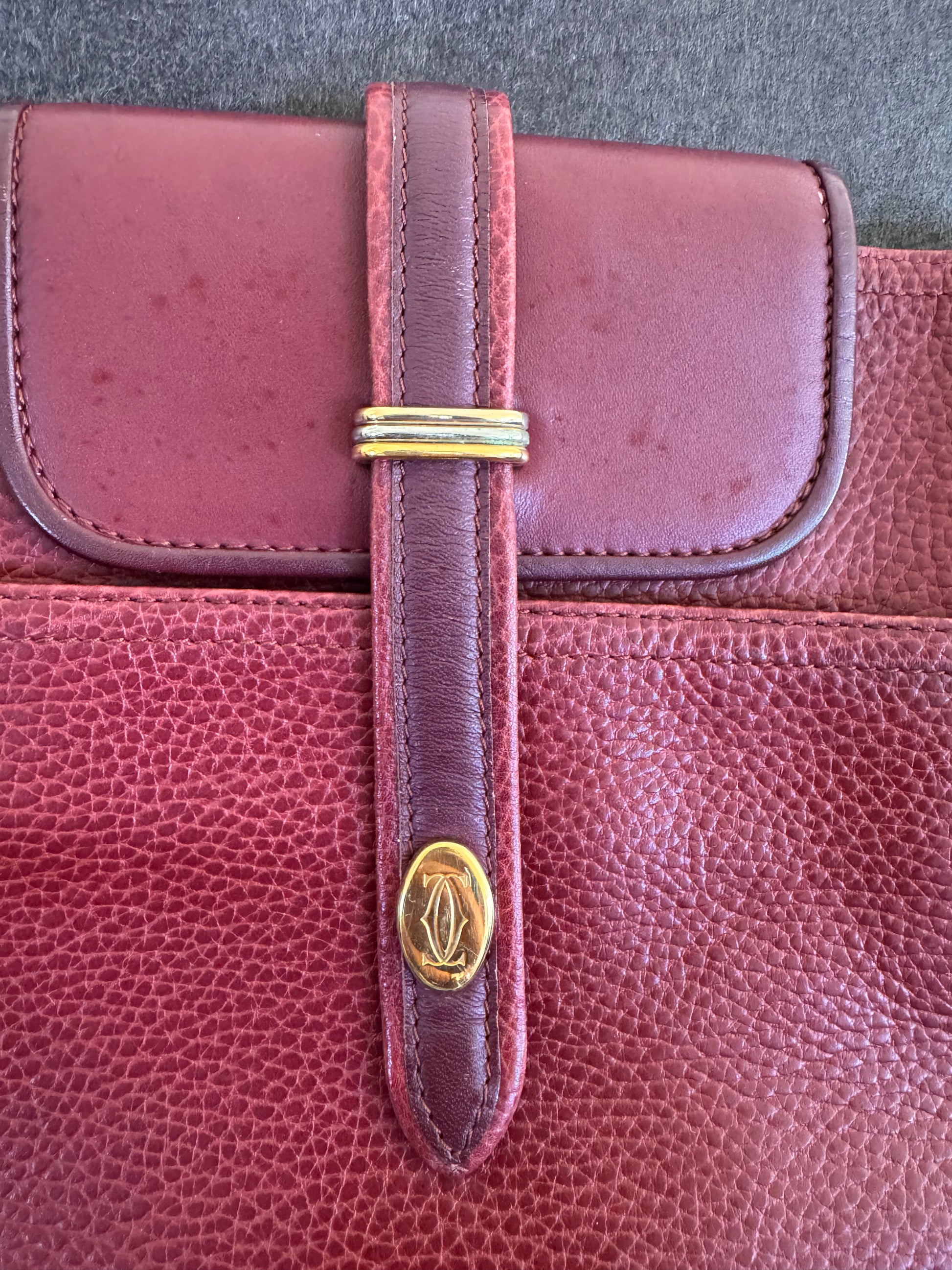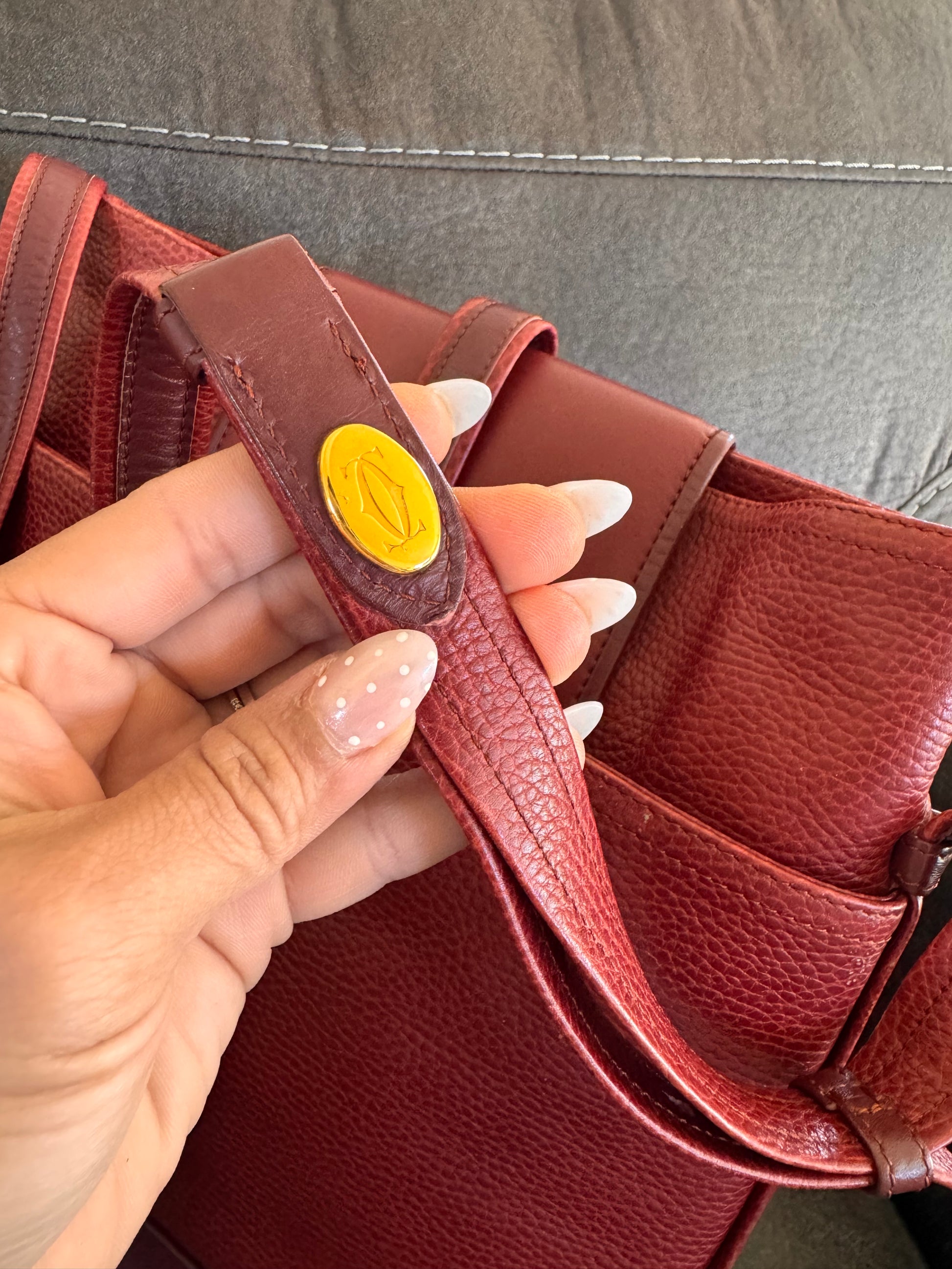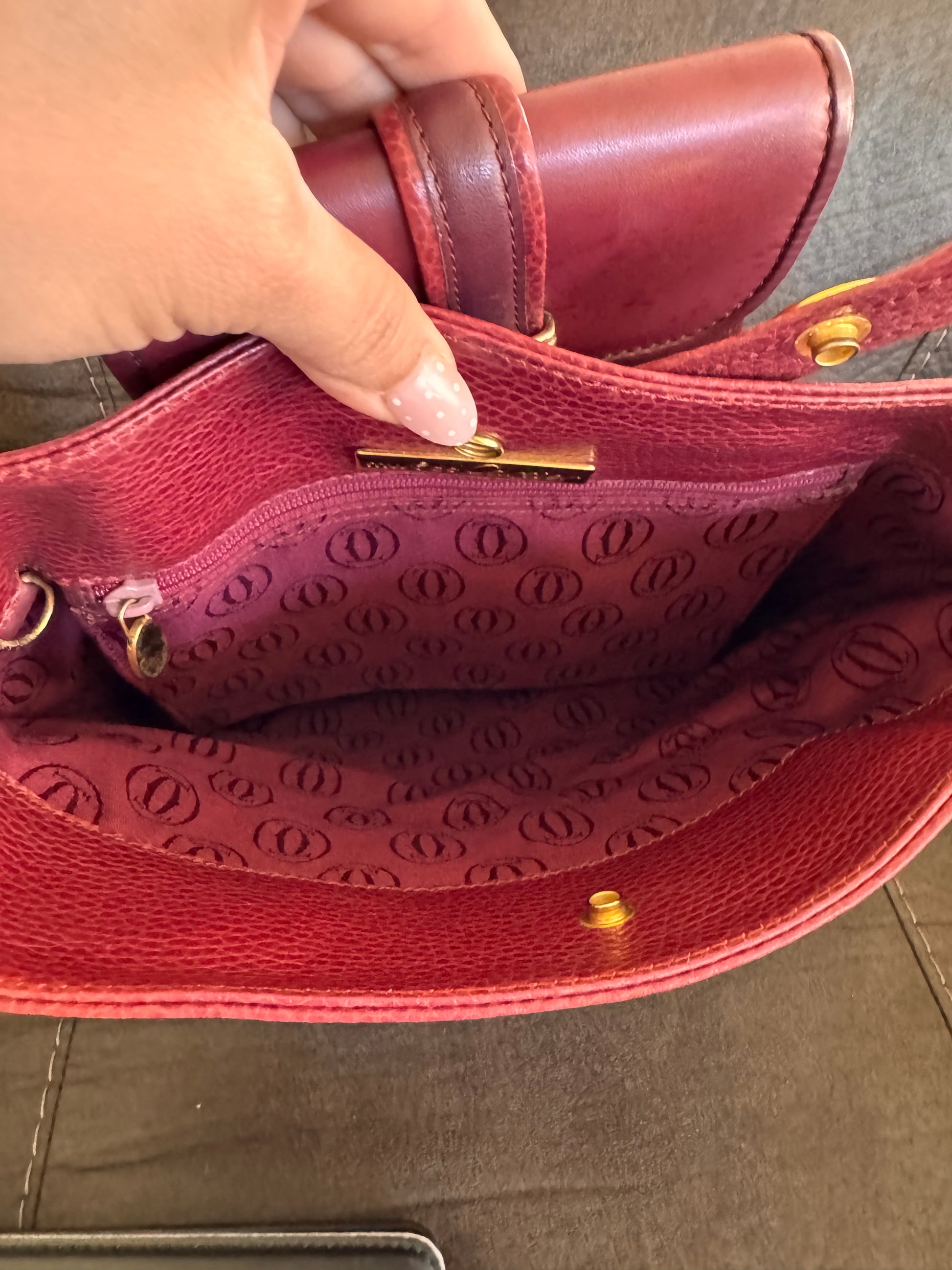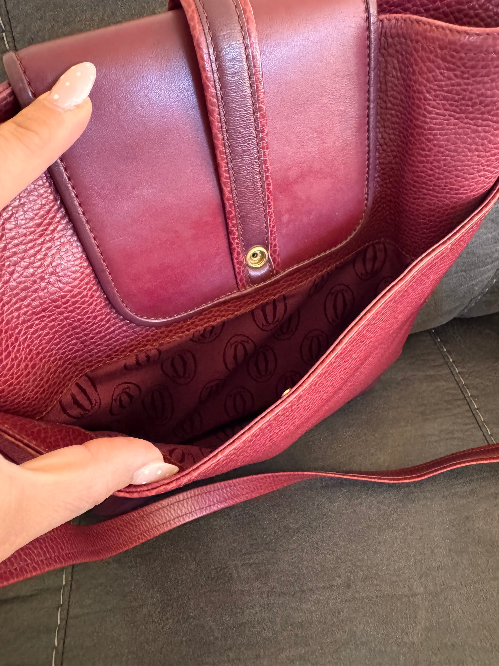Este es un bolso Must de Cartier, específicamente identificado como un modelo vintage en piel burdeos con herrajes dorados. Estos bolsos son conocidos por su intenso color burdeos y la sutil marca Cartier, que a menudo presenta el icónico logotipo "Must de Cartier" o el monograma 2C.