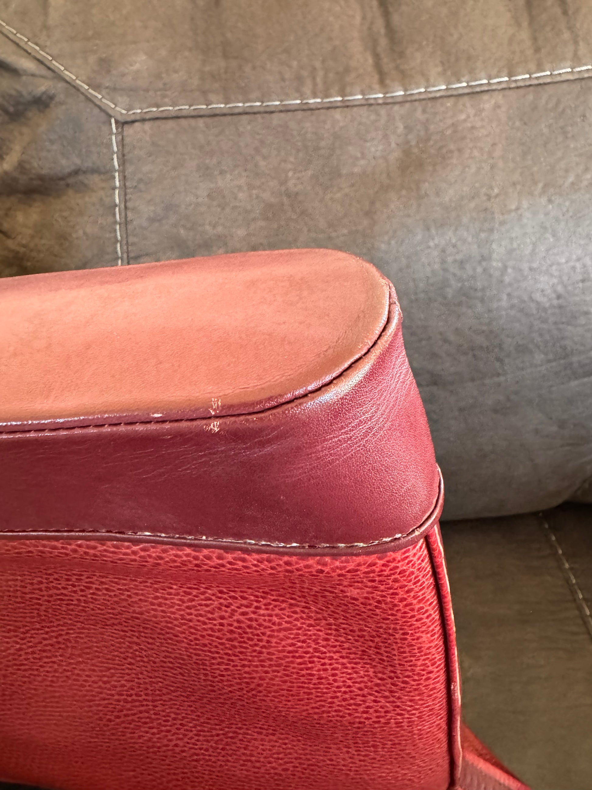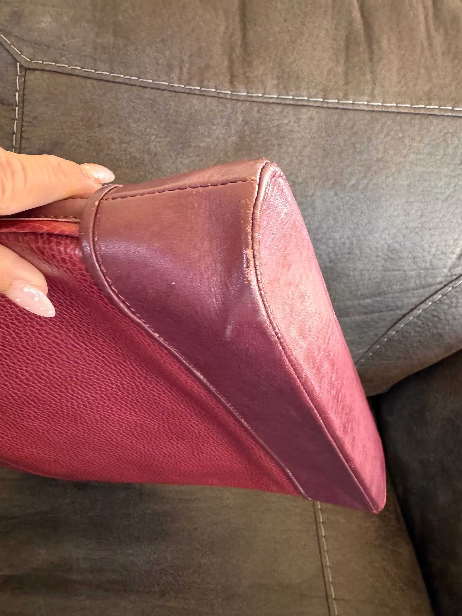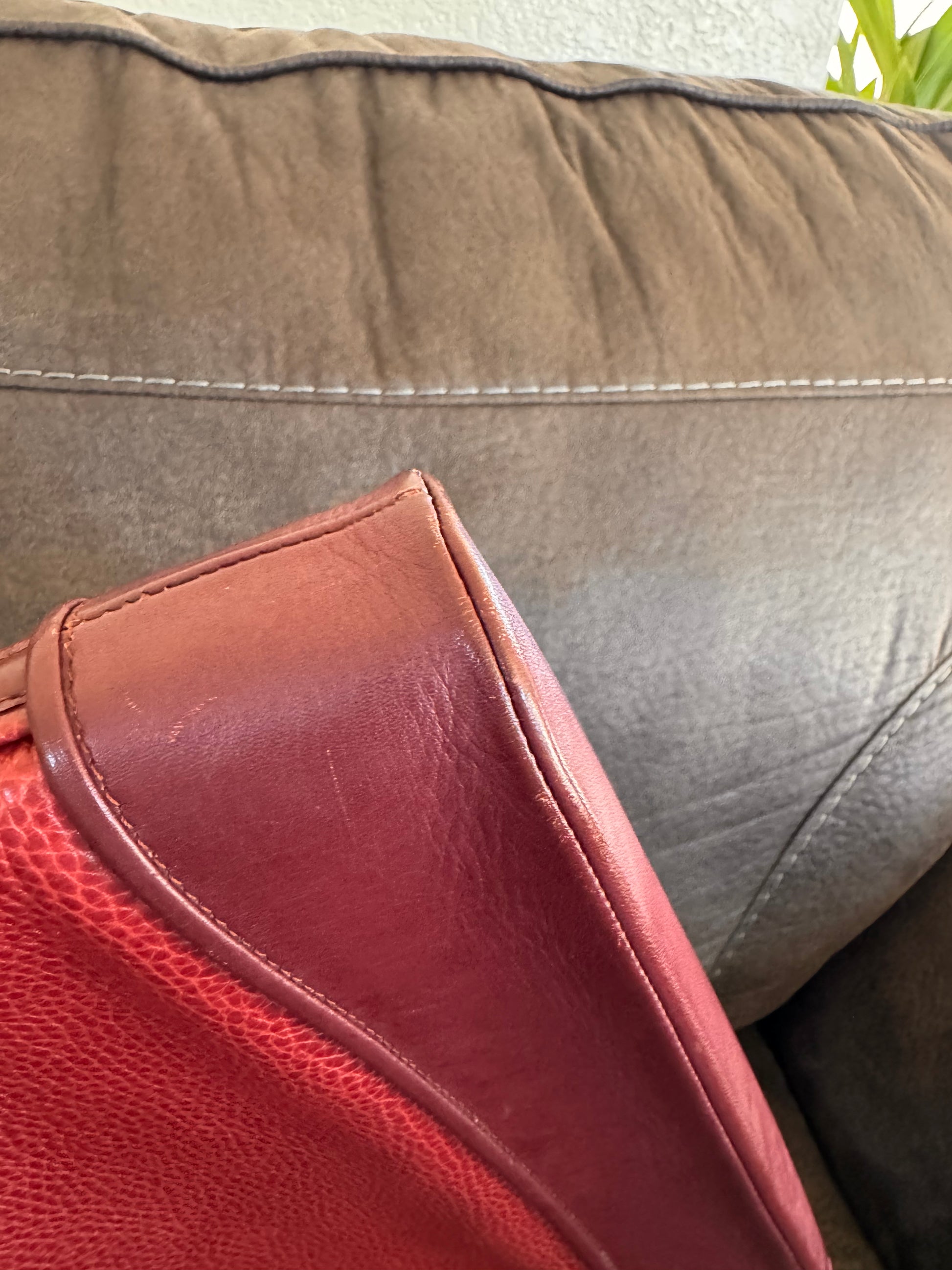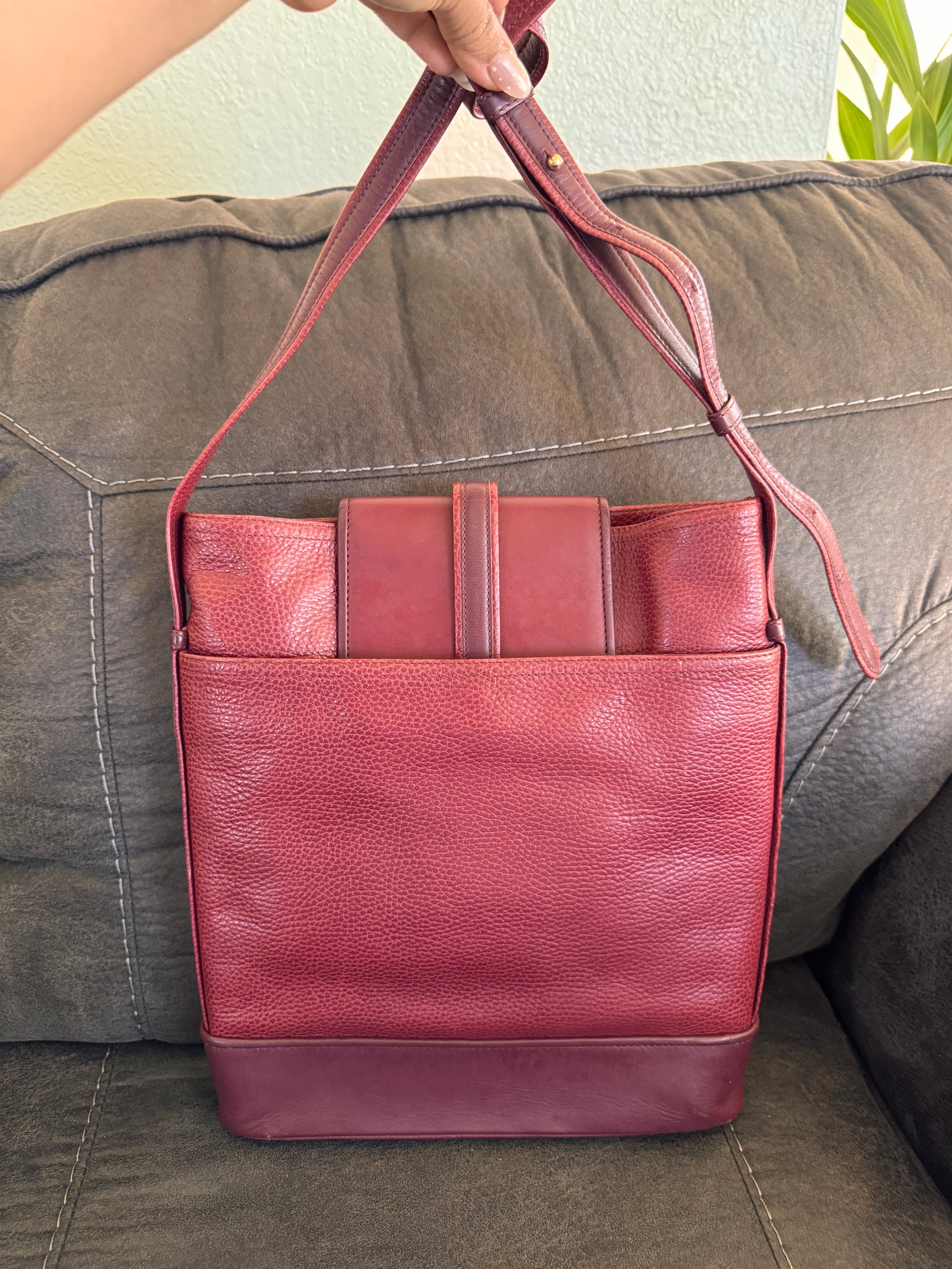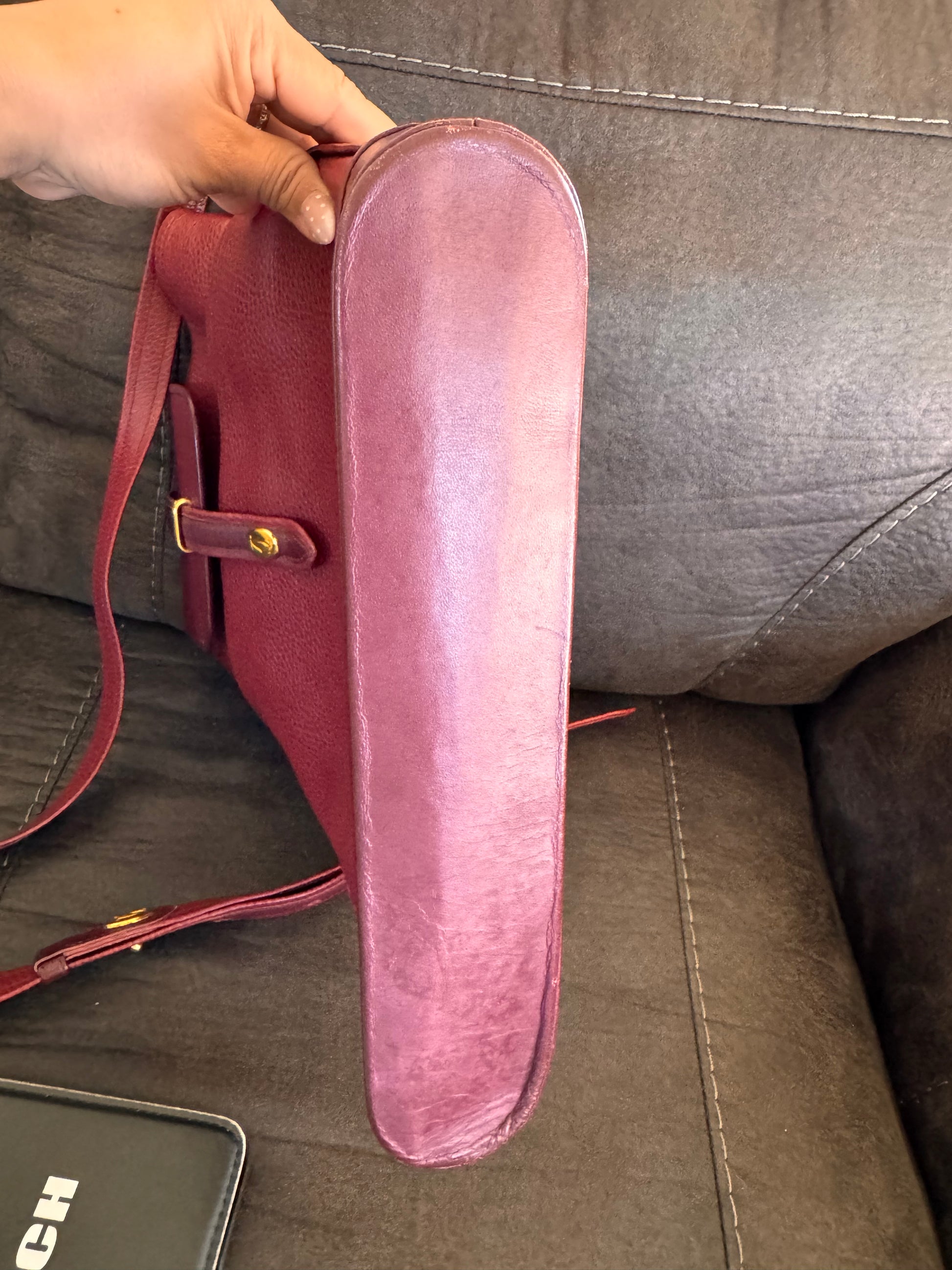 Este es un bolso Must de Cartier, específicamente identificado como un modelo vintage en piel burdeos con herrajes dorados. Estos bolsos son conocidos por su intenso color burdeos y la sutil marca Cartier, que a menudo presenta el icónico logotipo "Must de Cartier" o el monograma 2C.