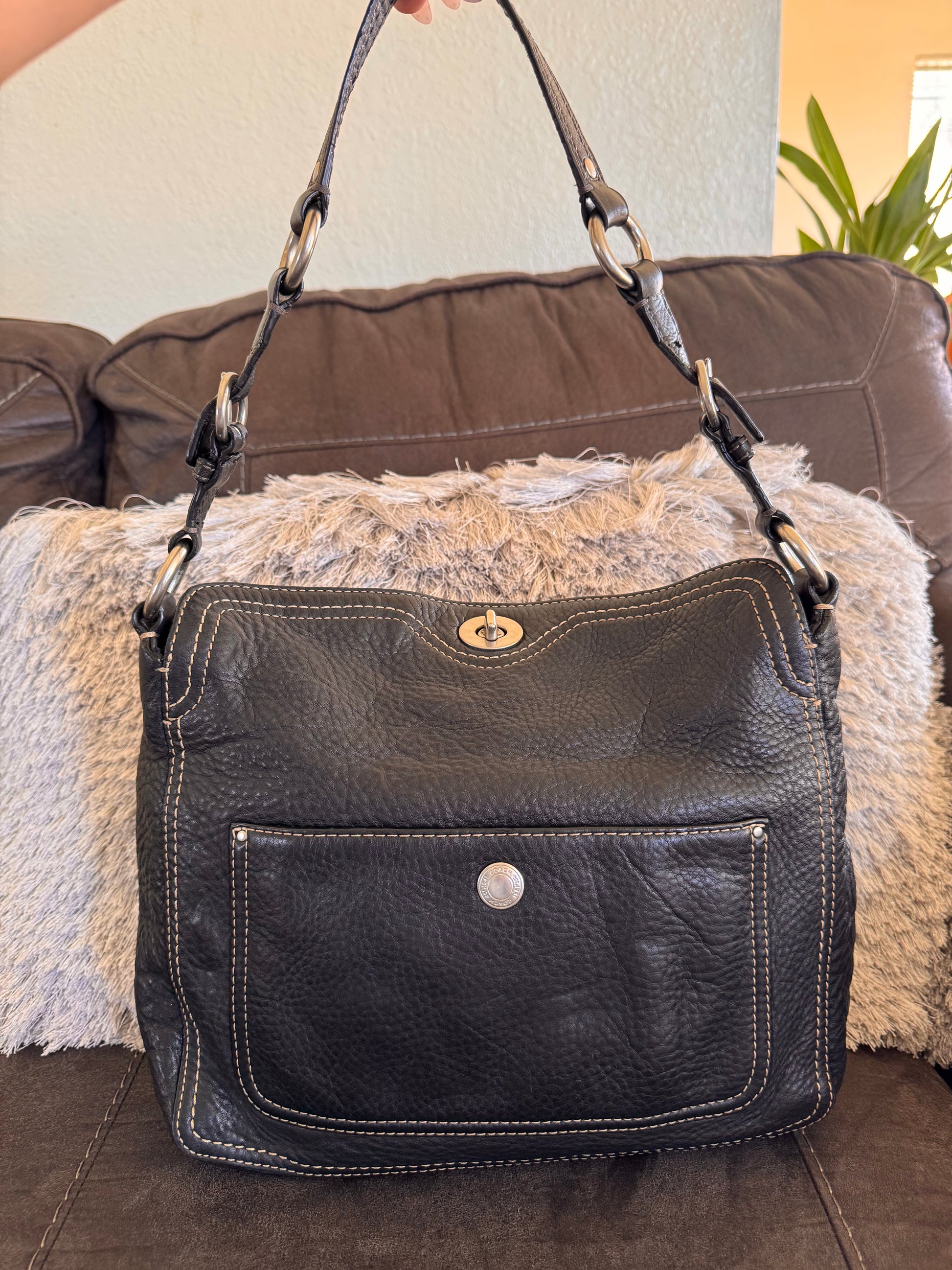 Bolso de hombro Coach Chelsea de piel granulada negra, identificado específicamente con el número de estilo F12338 o variantes similares de la línea Chelsea.