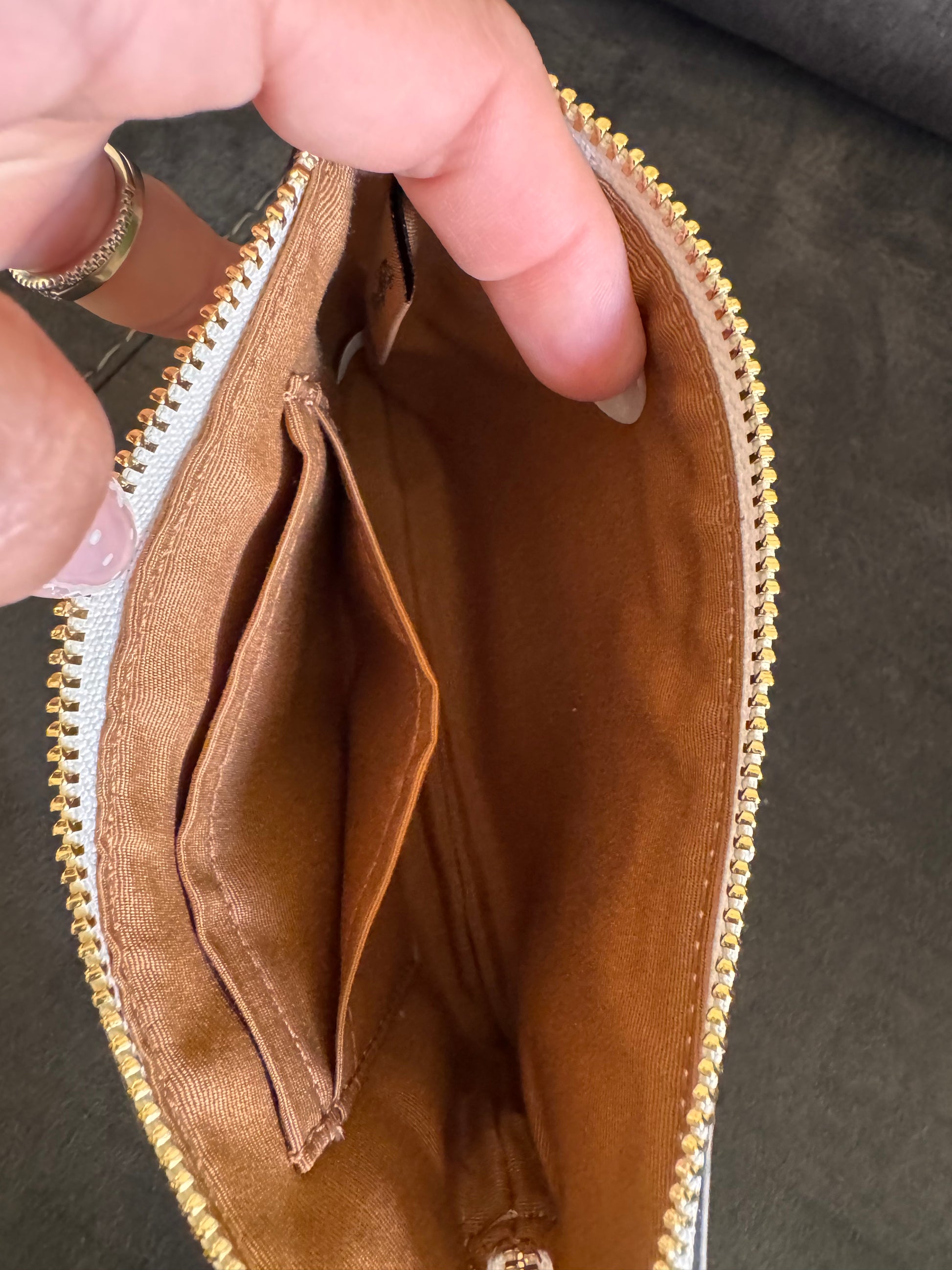 La cartera cuenta con cierre de cremallera, forro de tela, dos ranuras para tarjetas de crédito y una correa de mano.