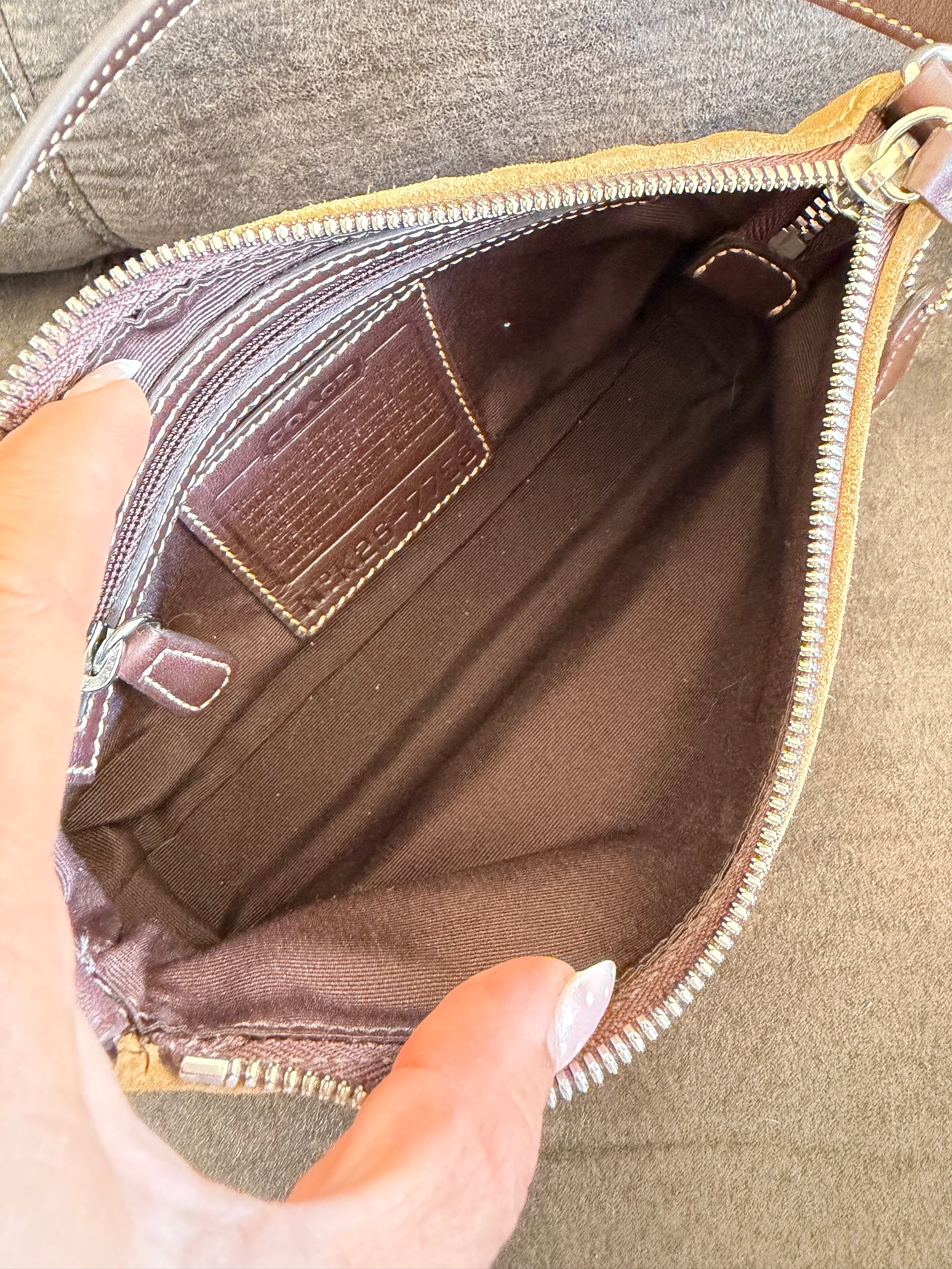 Este es un bolso de hombro pequeño de cuero y de gamuza Hampton Baguette vintage de Coach.