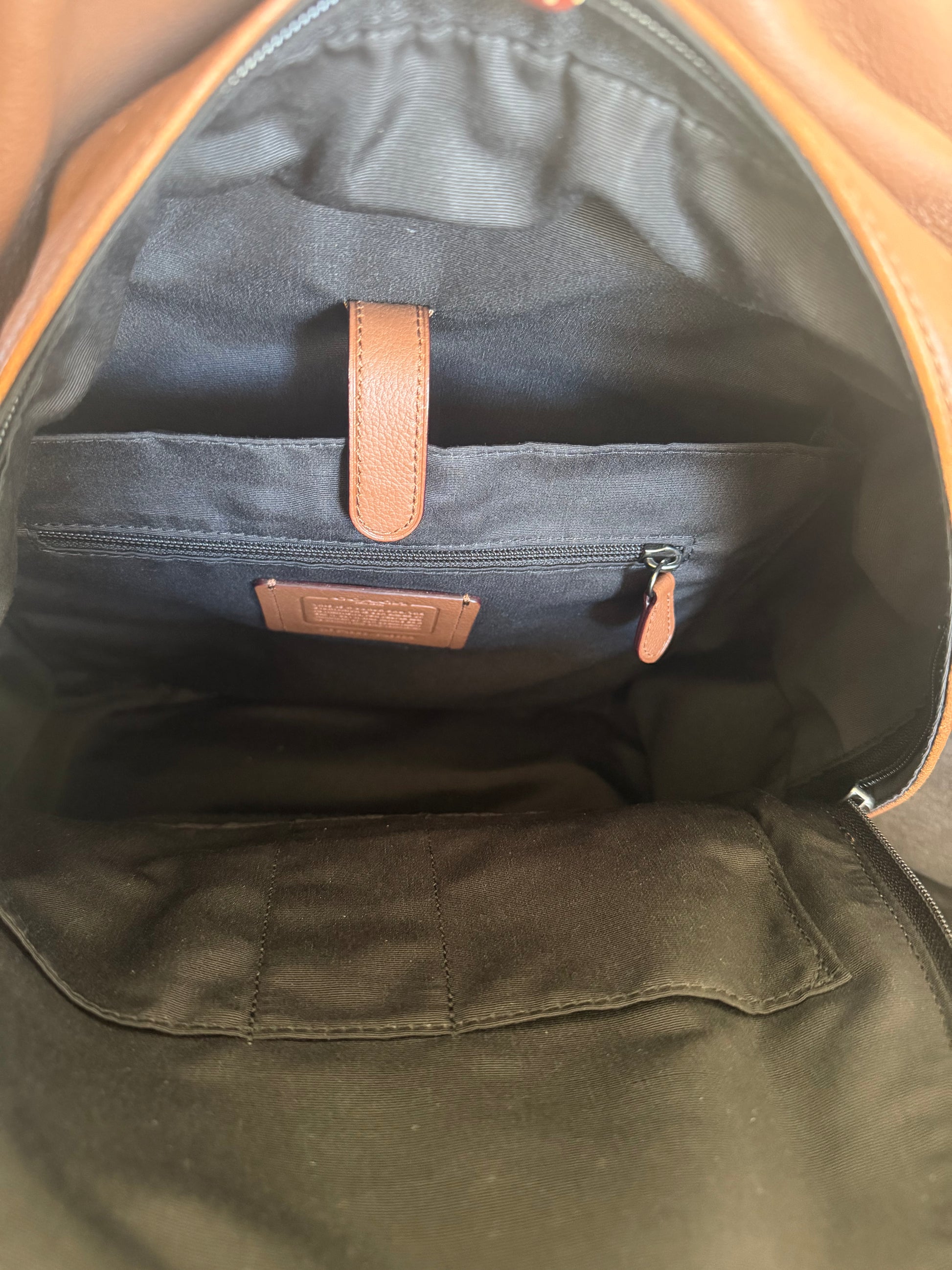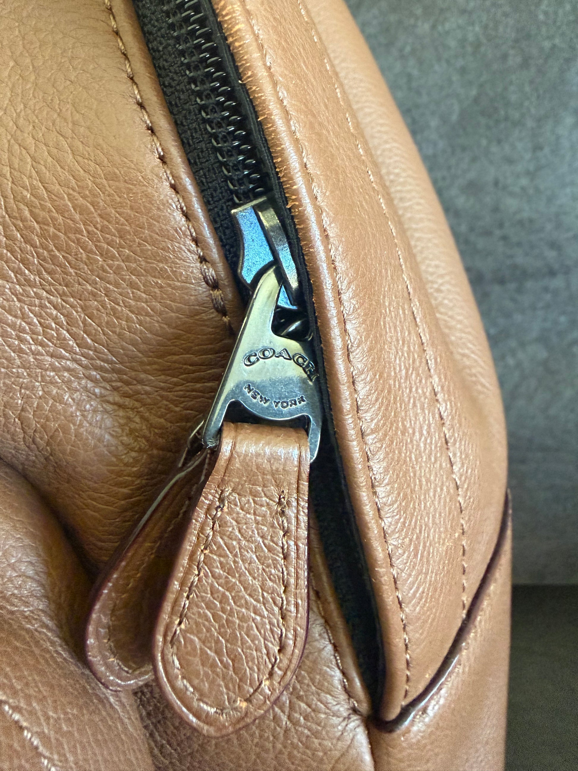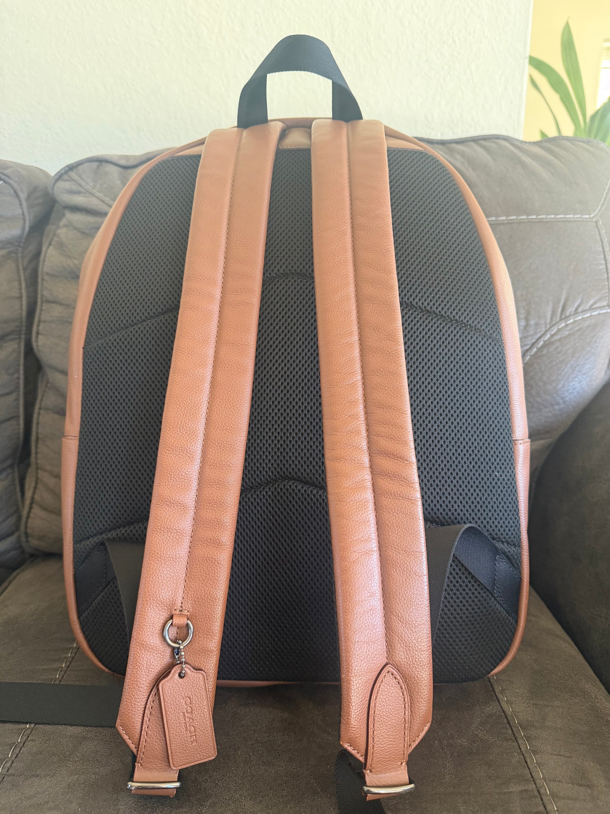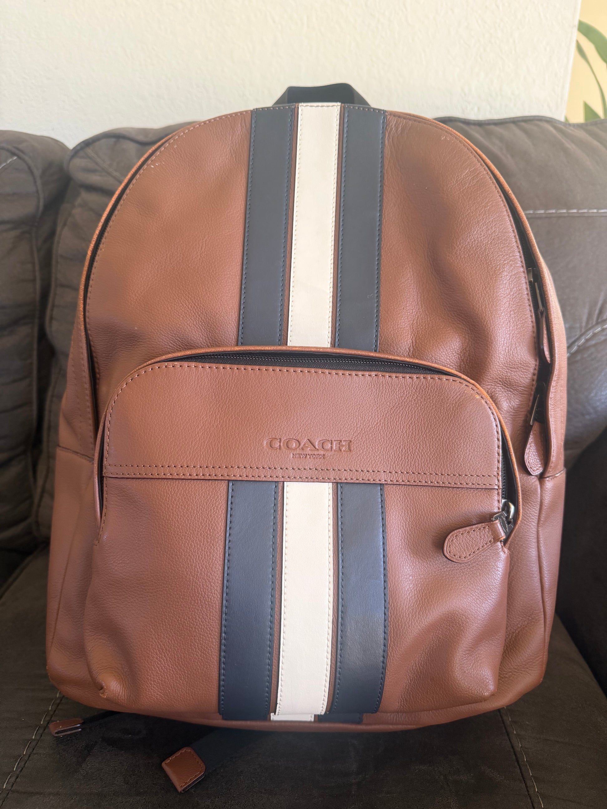 Esta es una mochila Coach Houston con raya universitaria en cuero marrón.