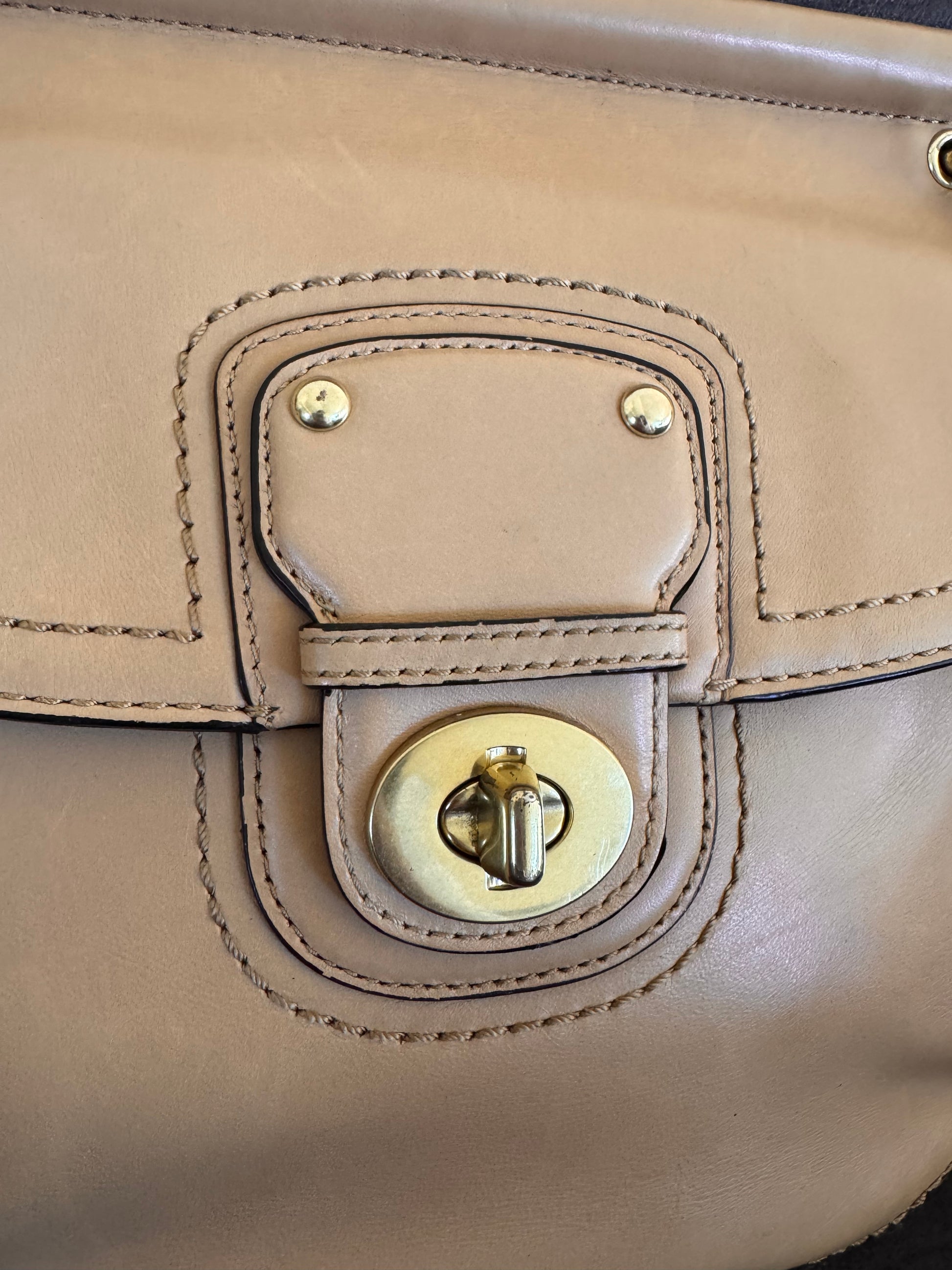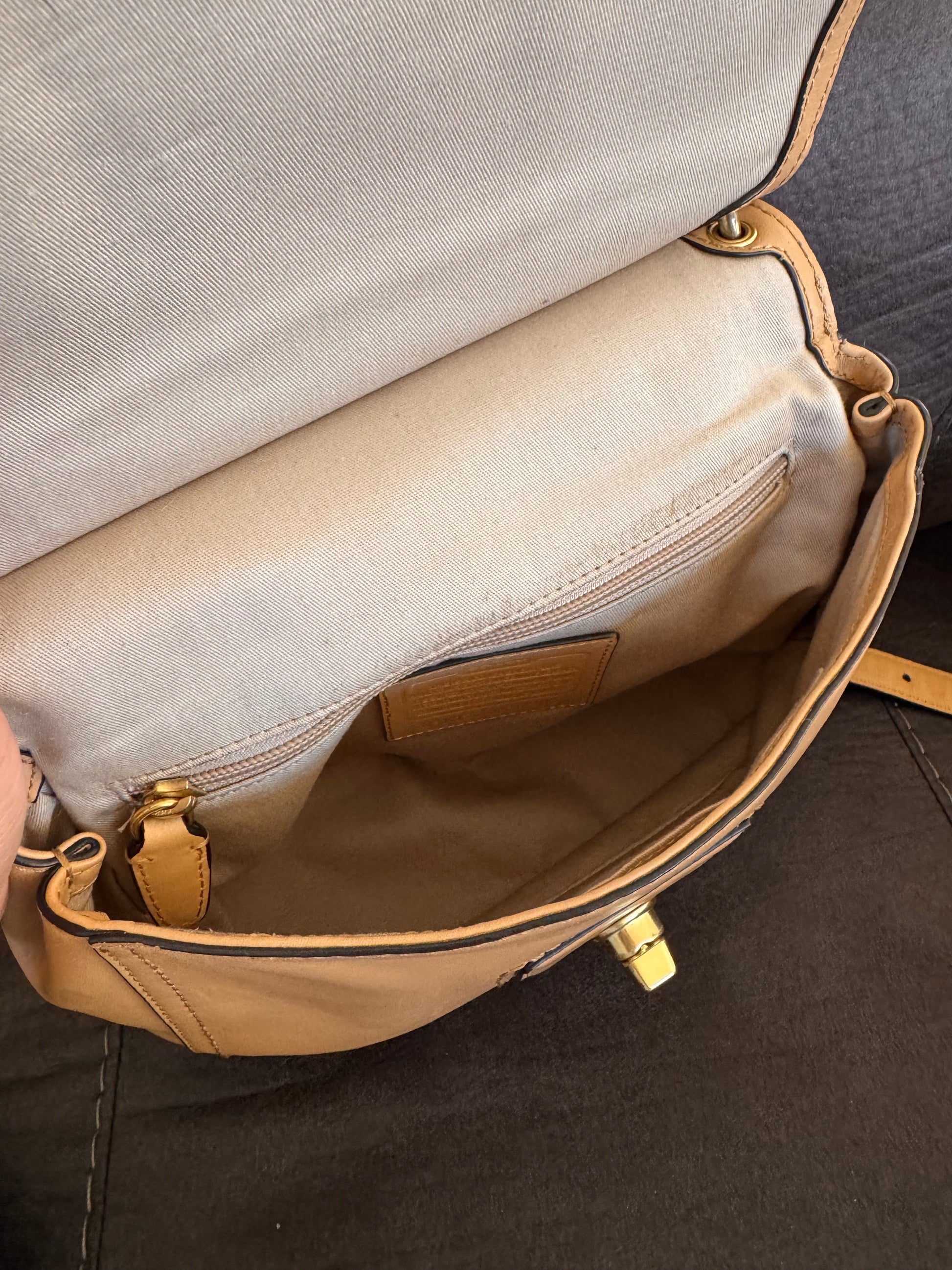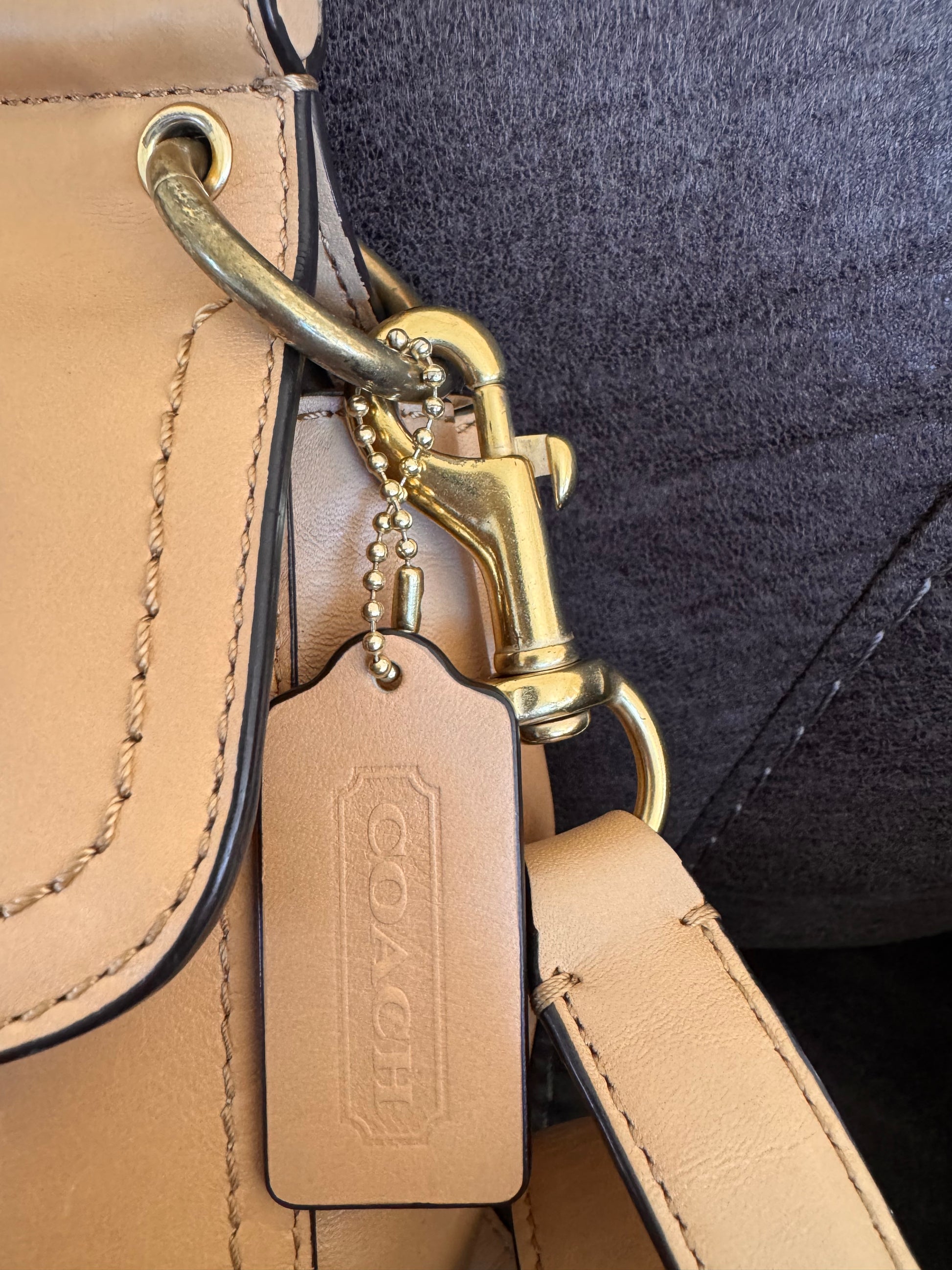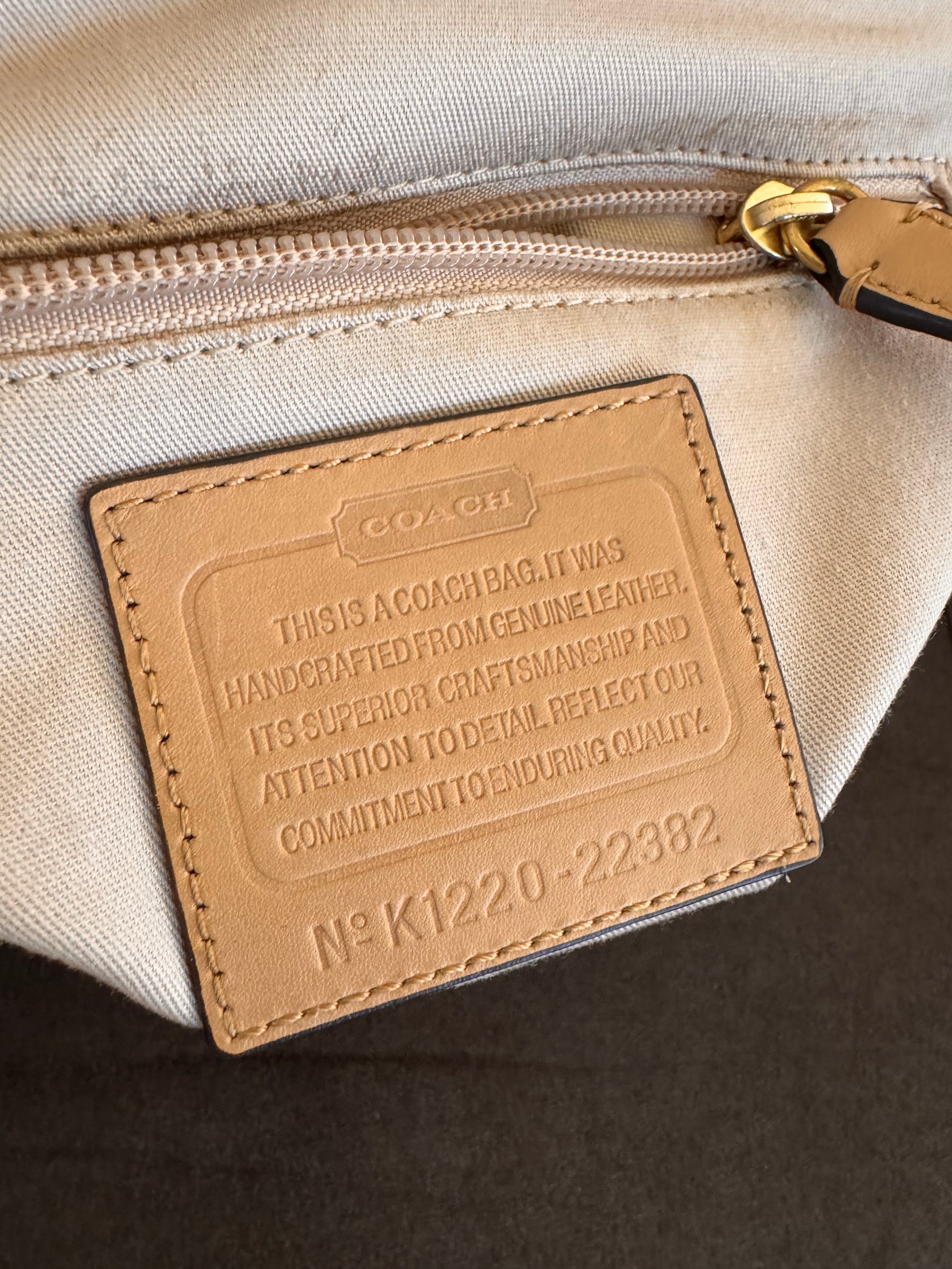 Elementos de diseño: Presenta un distintivo cierre de giro en la solapa frontal, una correa cruzada y, a menudo, incluye las etiquetas colgantes distintivas de Coach.