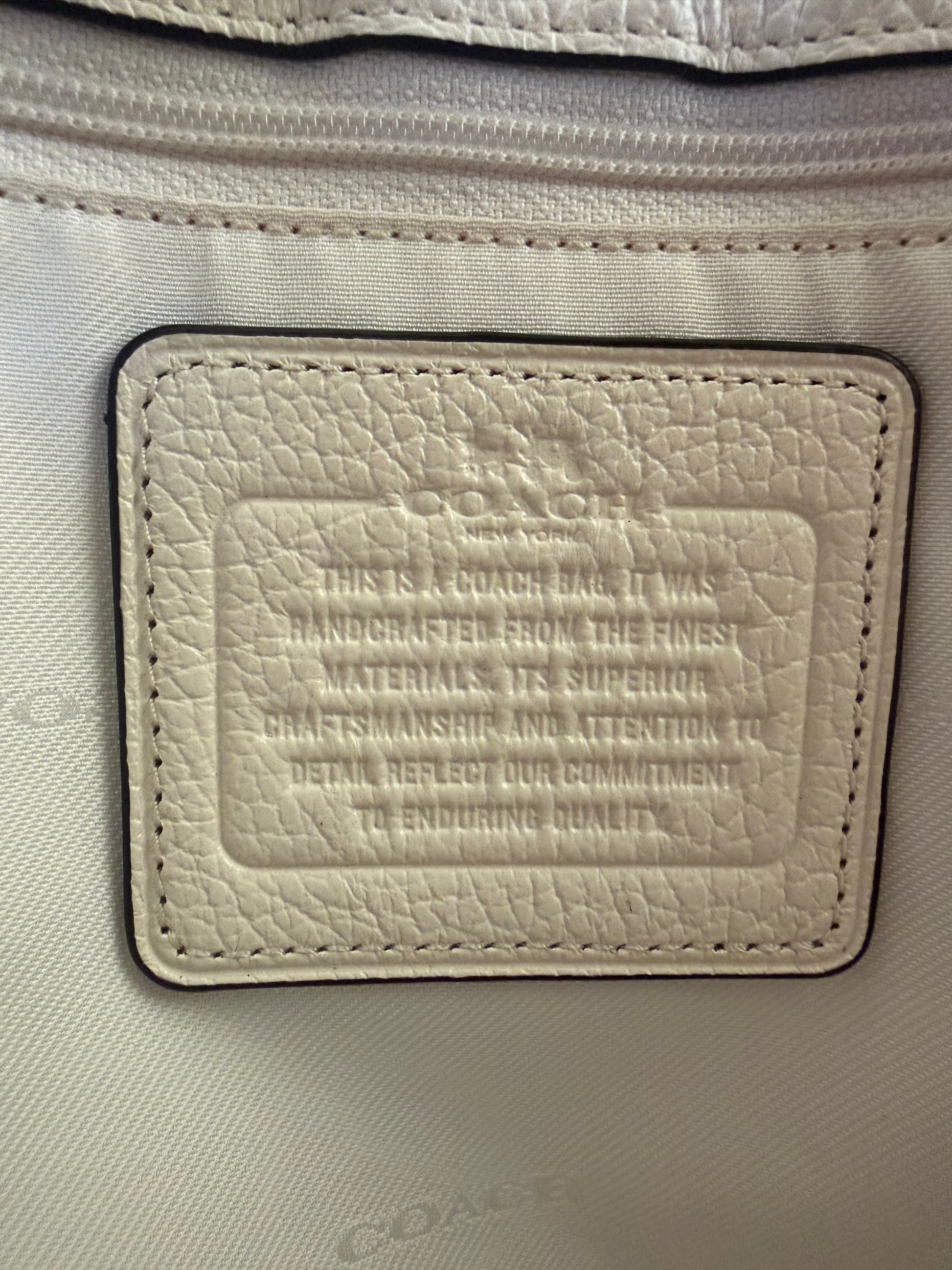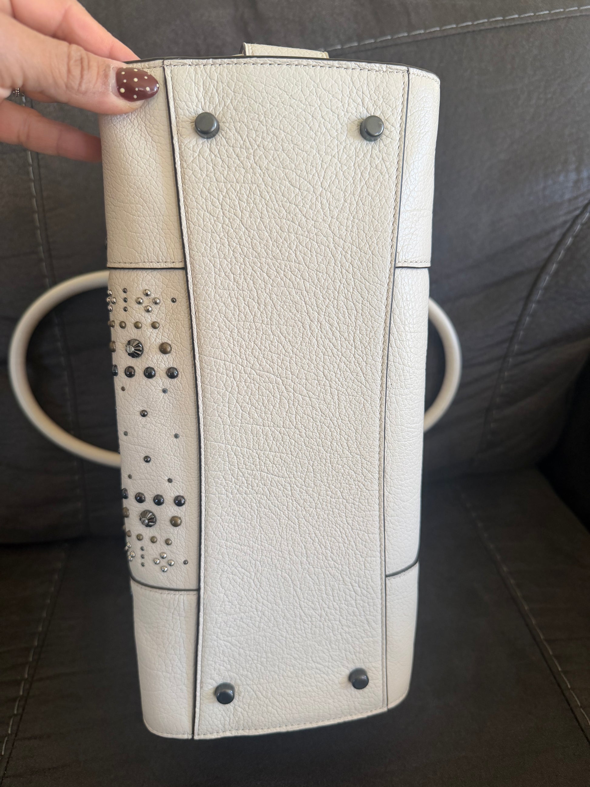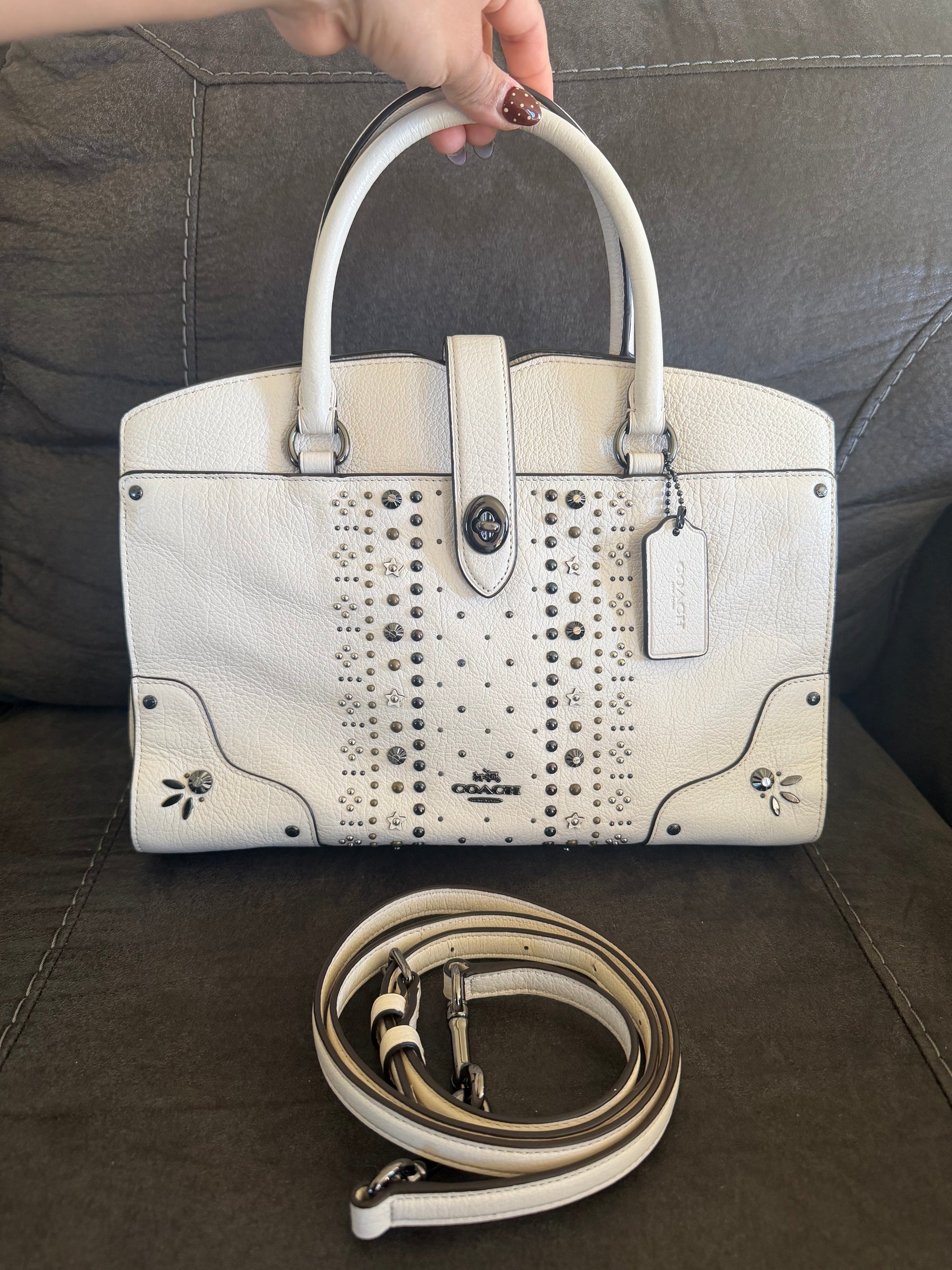 Este es un Coach Mercer Satchel en cuero granulado pulido con remaches de bandana en color tiza. Es un bolso versatil que puedes llevar al hombro y tambien cuenta con una correa desmontable para llevar de medio lado.