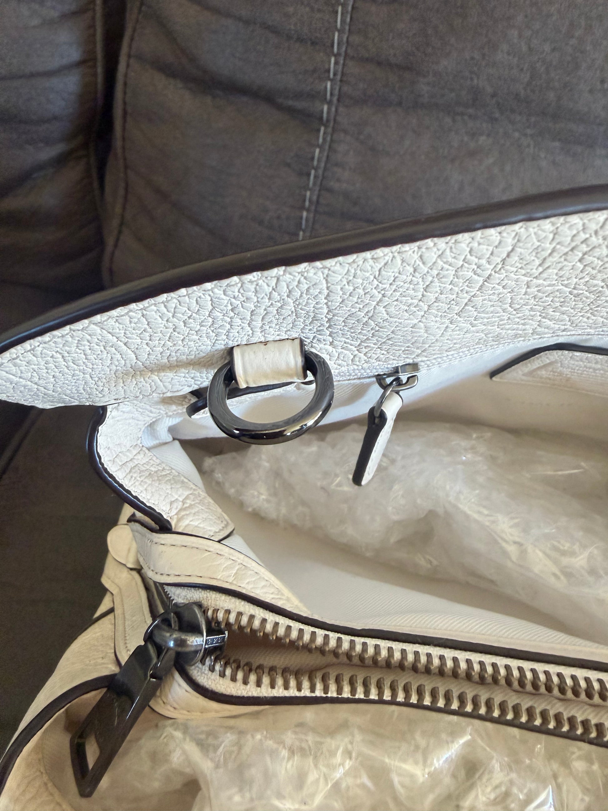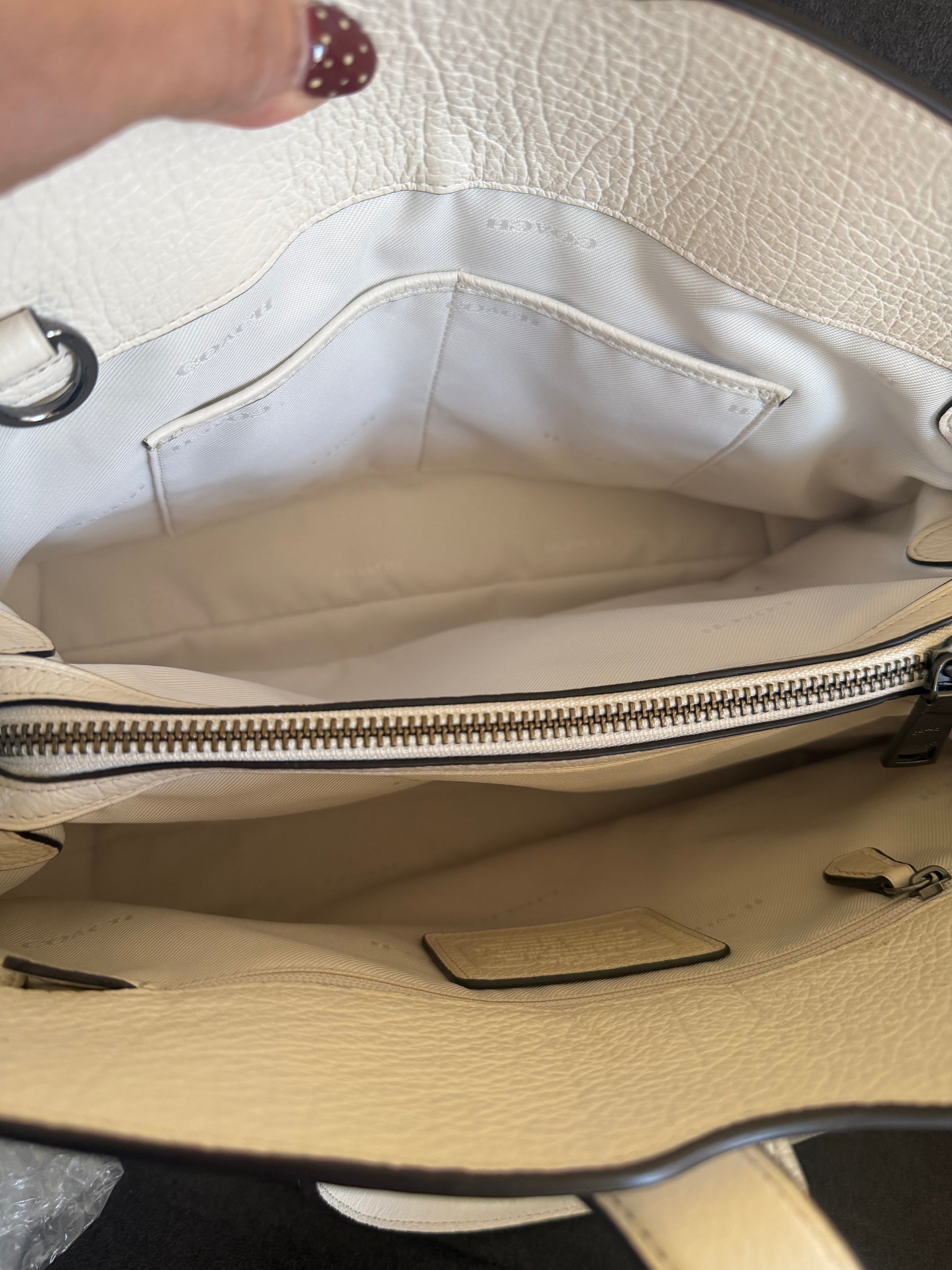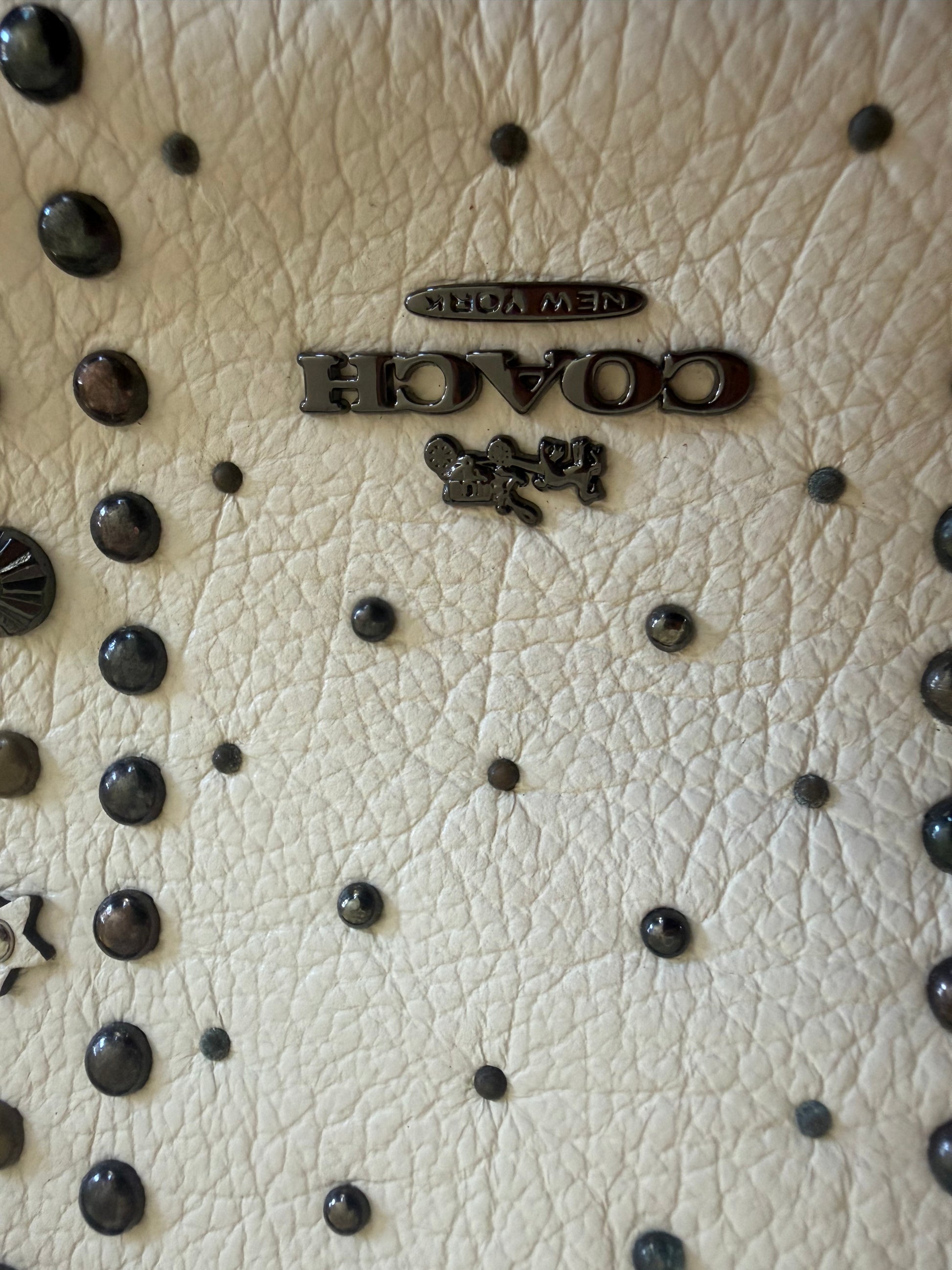 Este es un Coach Mercer Satchel en cuero granulado pulido con remaches de bandana en color tiza. Es un bolso versatil que puedes llevar al hombro y tambien cuenta con una correa desmontable para llevar de medio lado.