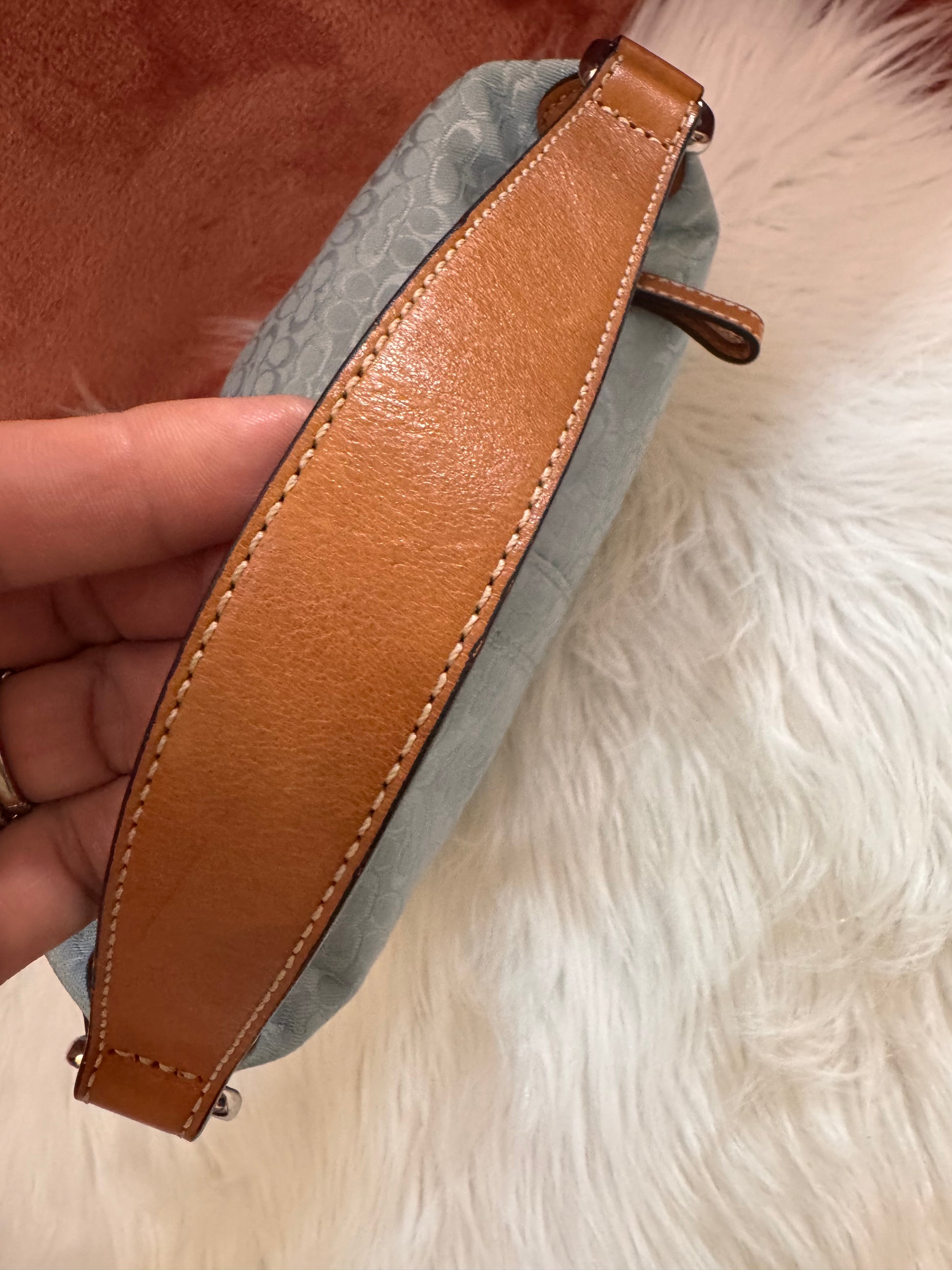 Coach Vintage Mini Signature Pouch Bag o un bolso de hombro Demi en color azul hielo, con el icónico monograma de lona de Coach. Este estilo fue popular a principios de la década de 2000 y a menudo se catalogaba como vintage Y2K.