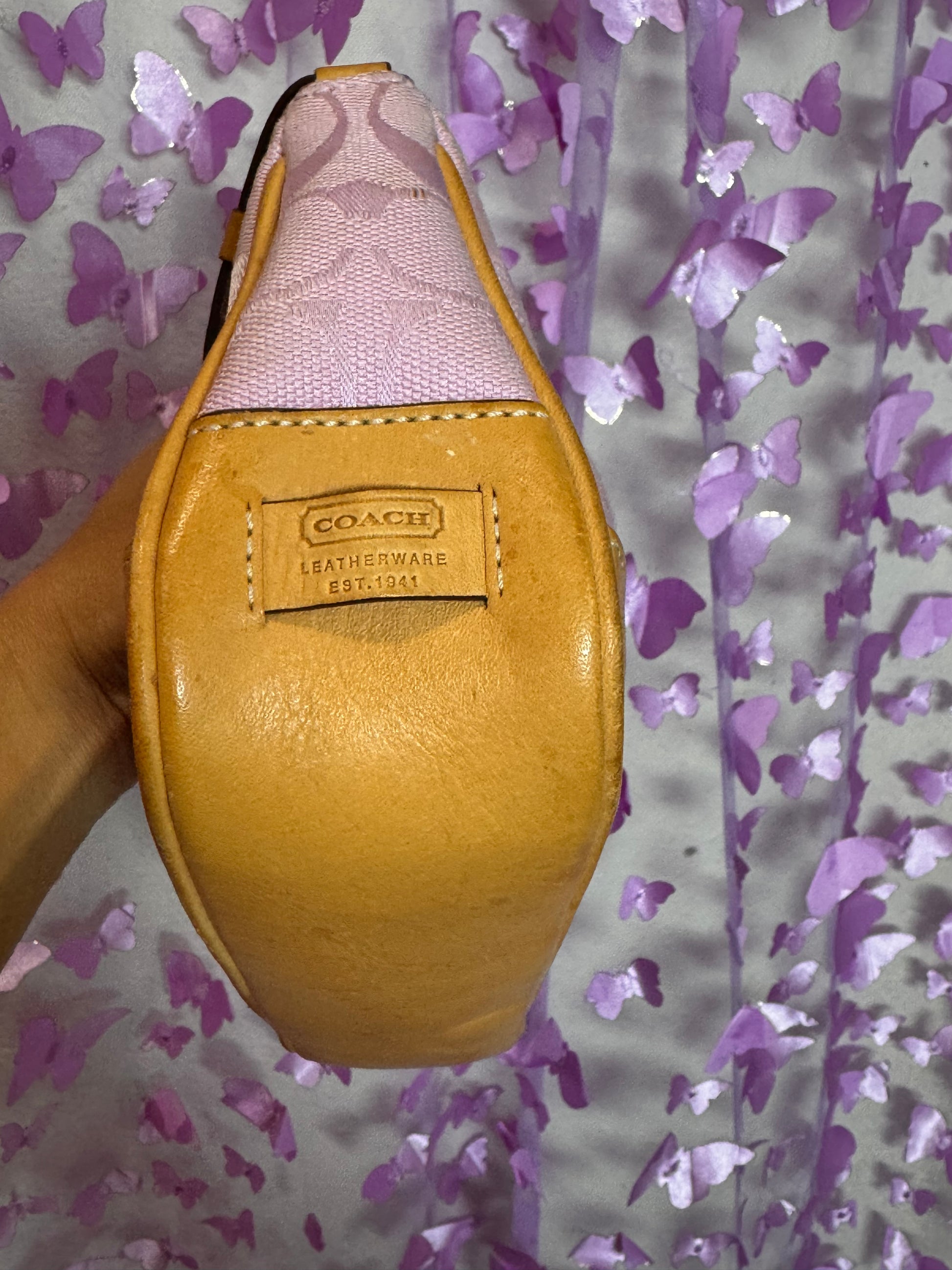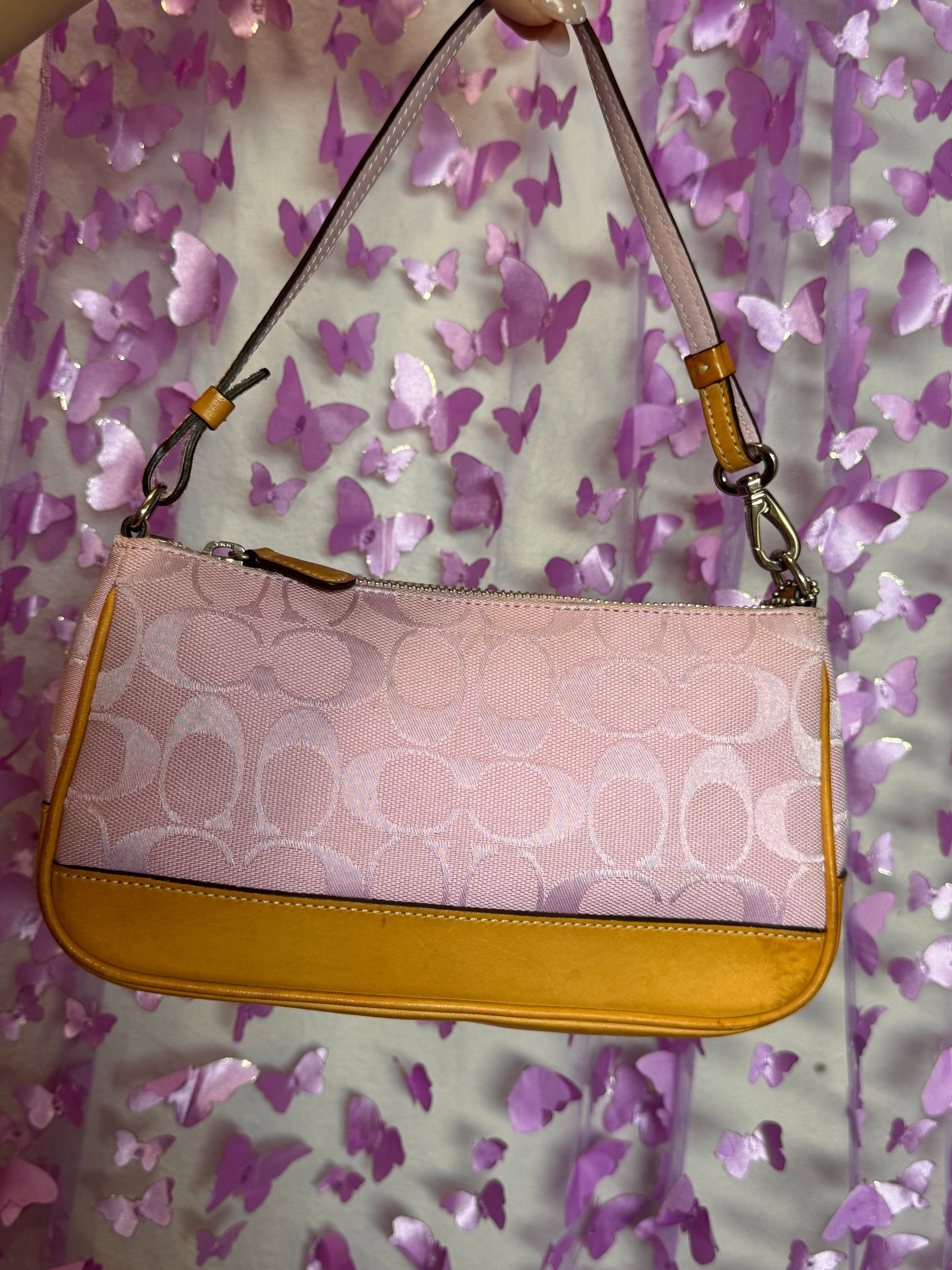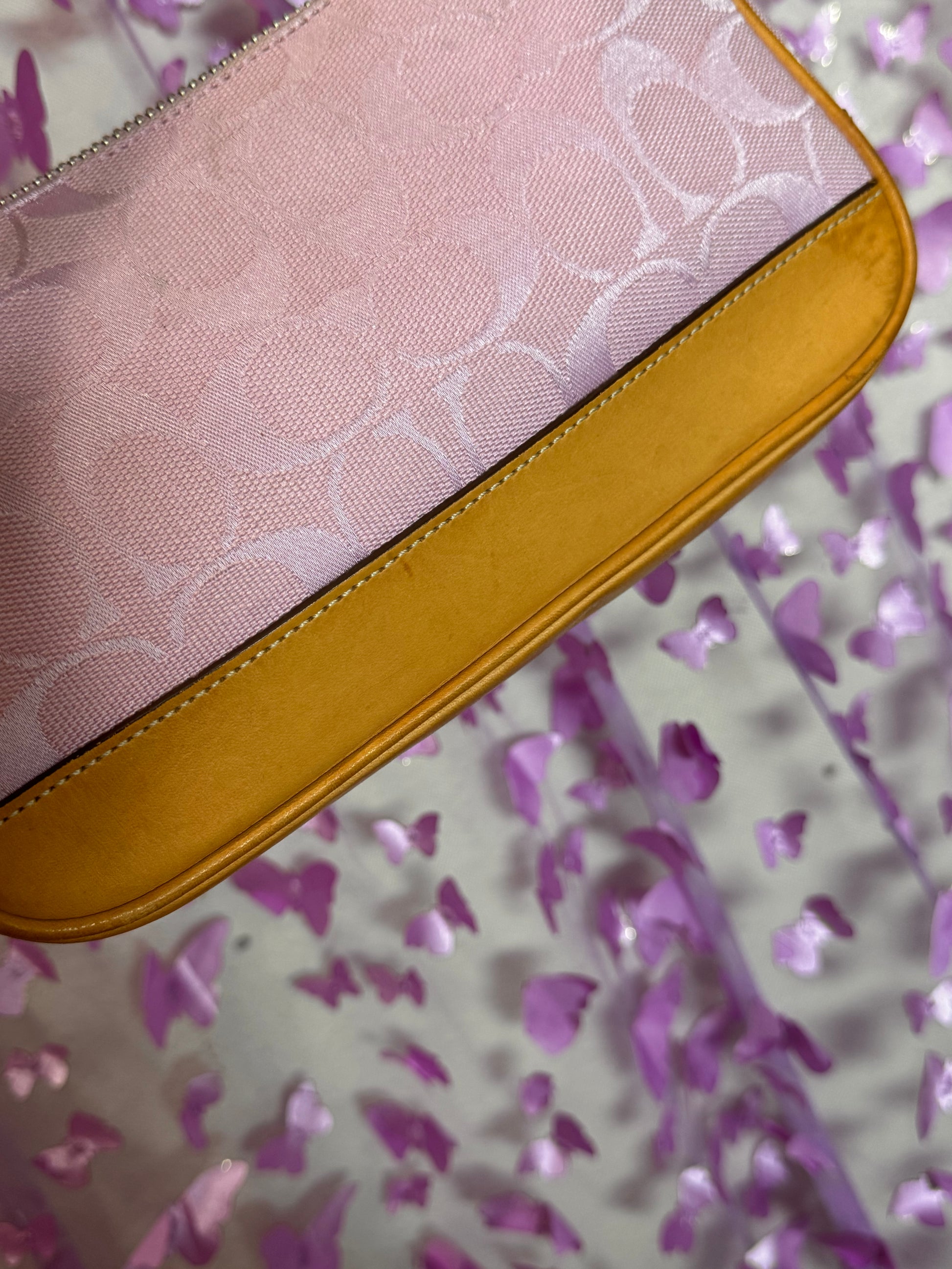 Es un bolso de hombro Coach Signature Demi Mini Pouch en rosa, también conocido como el Coach 6094 Hampton Demi Shoulder Bag. Este bolso de inspiración vintage luce el icónico monograma de Coach sobre lona o tela jacquard rosa, con ribete de piel color canela y rosa con una sola correa para el hombro