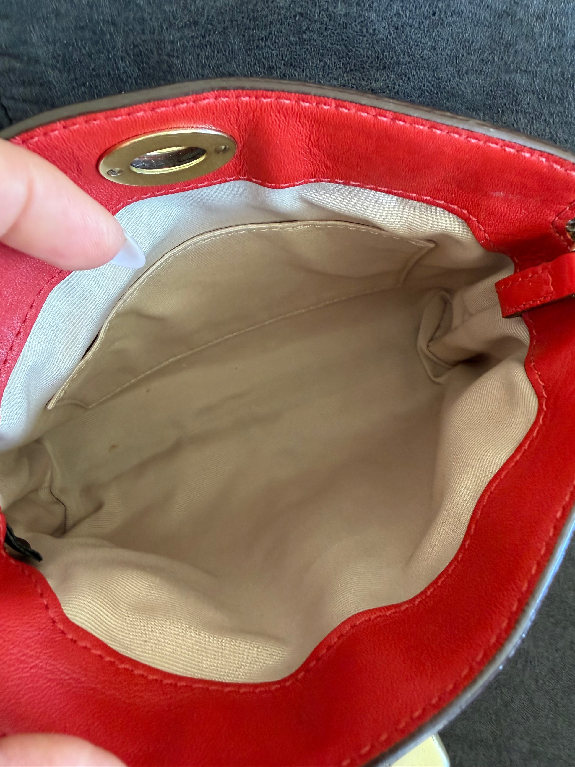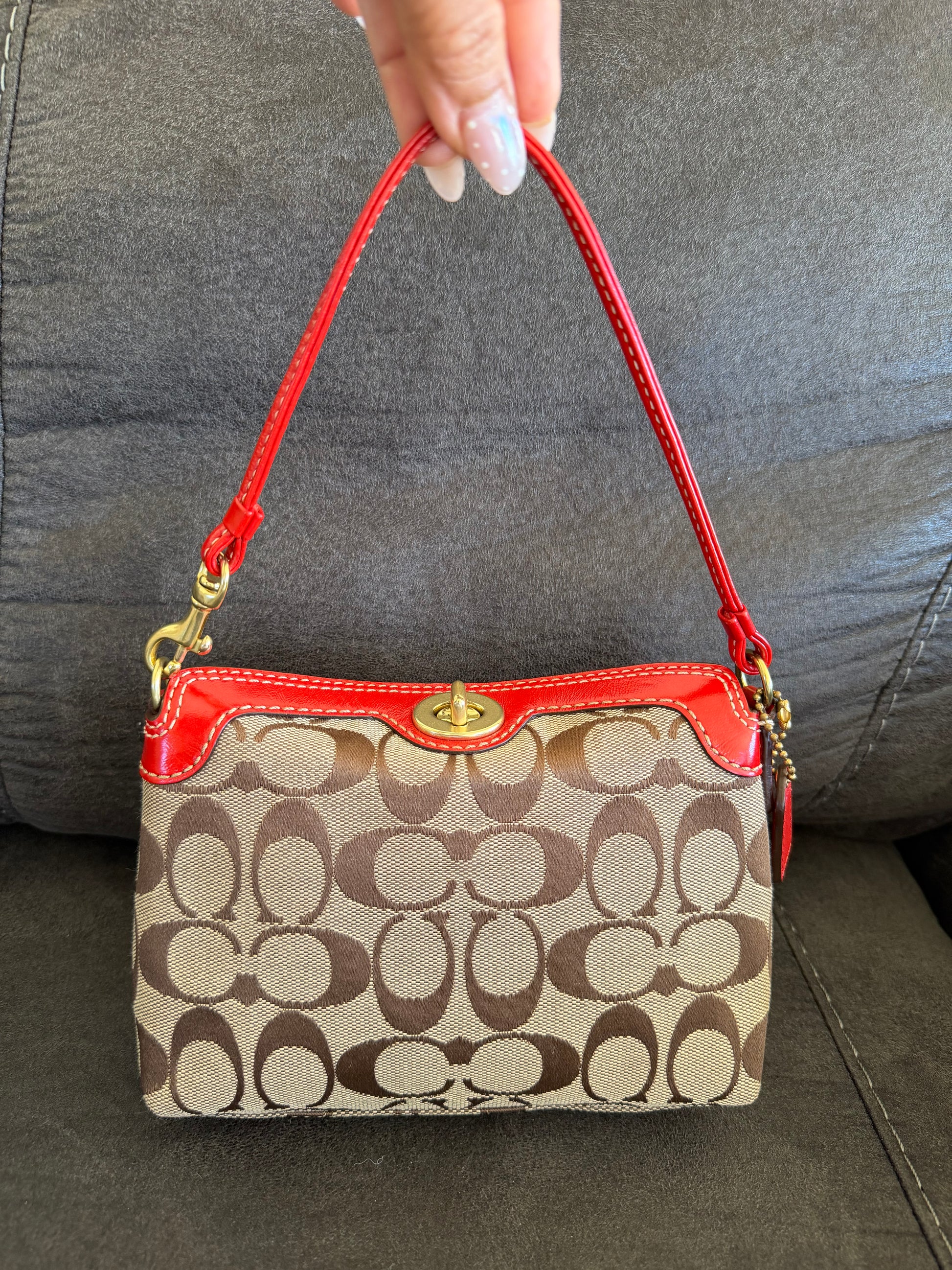 Este es un mini bolso Coach Signature Turnlock de lona y detalles de cuero. Herrajes color dorados.