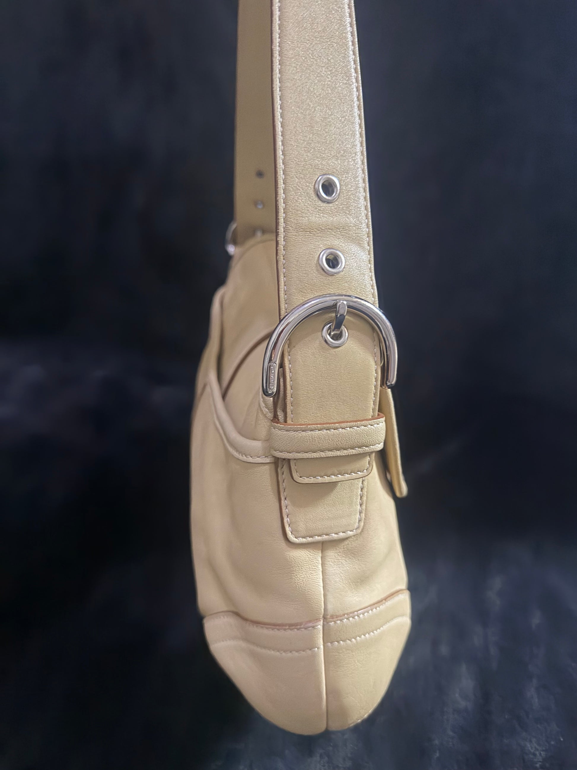Sumérgete en la elegancia clásica de principios de los 2000 con este bolso de hombro vintage Coach Soho, elaborado artesanalmente en suave piel color beige. Esta pieza cuenta con herrajes plateados con el logotipo de Coach grabado y el icónico cierre magnético estilo cinturón Soho. El interior está forrado de satén, combinando lujo y practicidad en este accesorio atemporal.