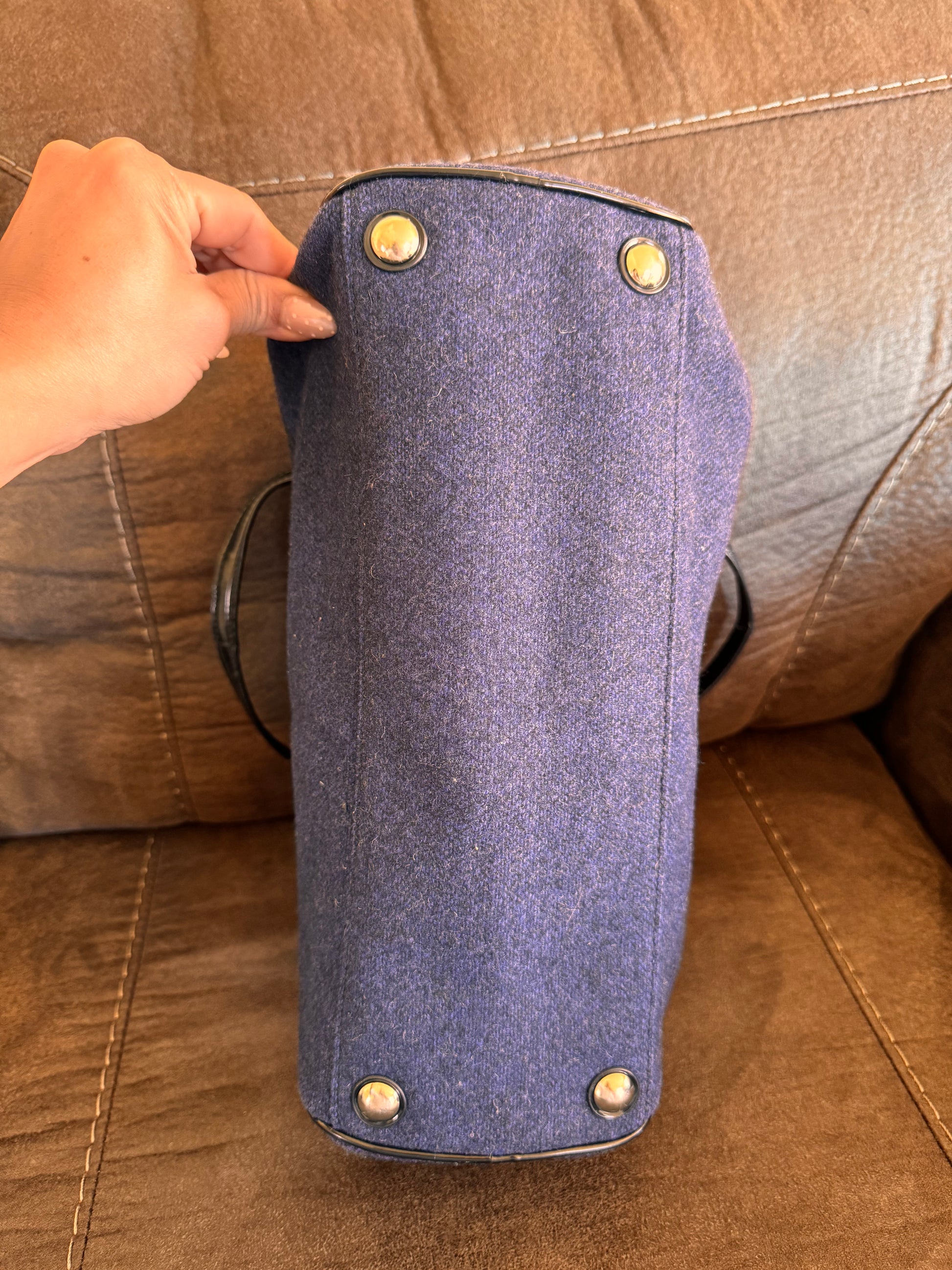Material: Exterior de lana con un característico estampado de rayas en colores como el carbón y el azul cobalto con ribete de charol en las asas.