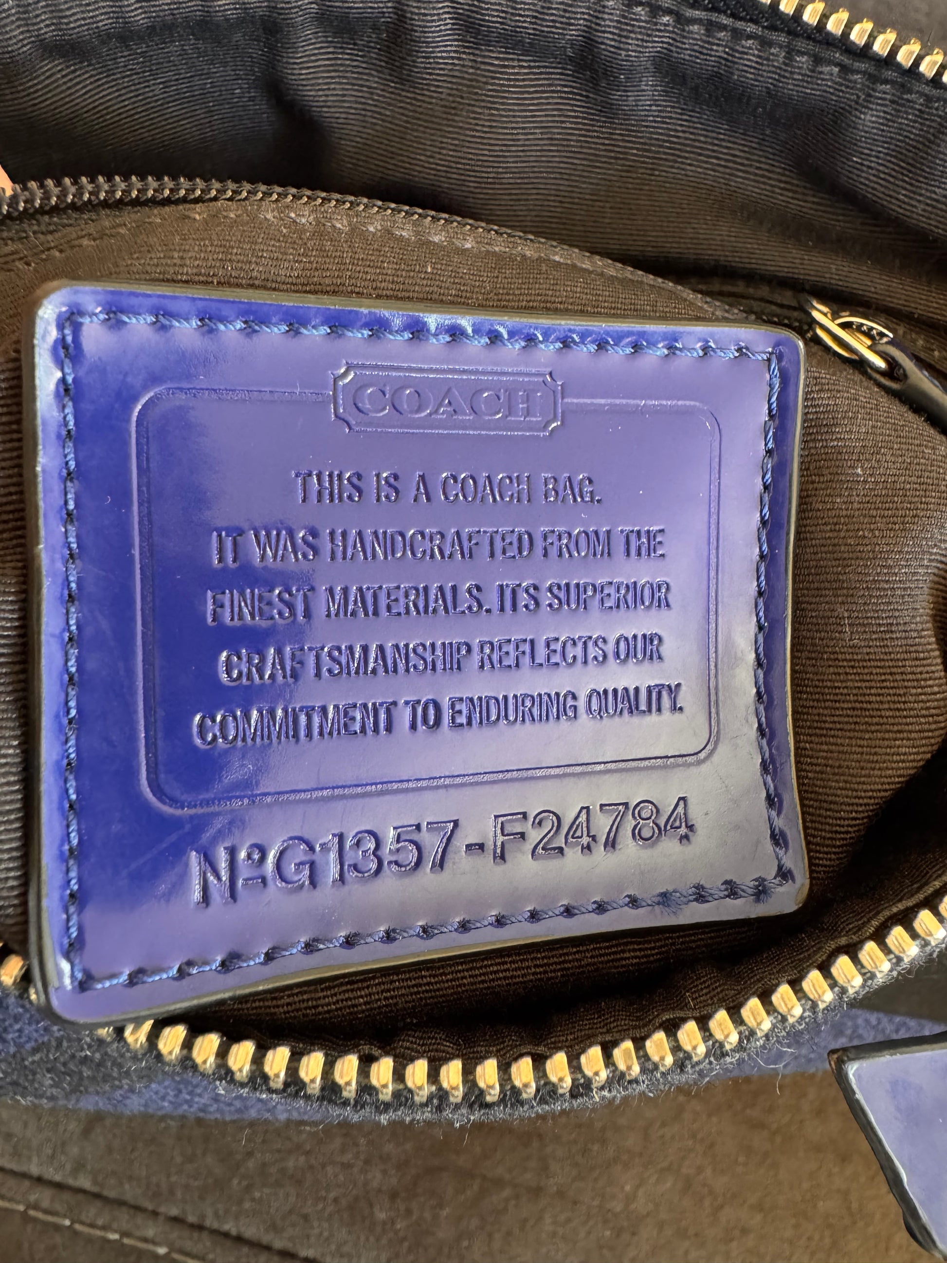 El bolso es un Coach Signature Stripe Wool Satchel.