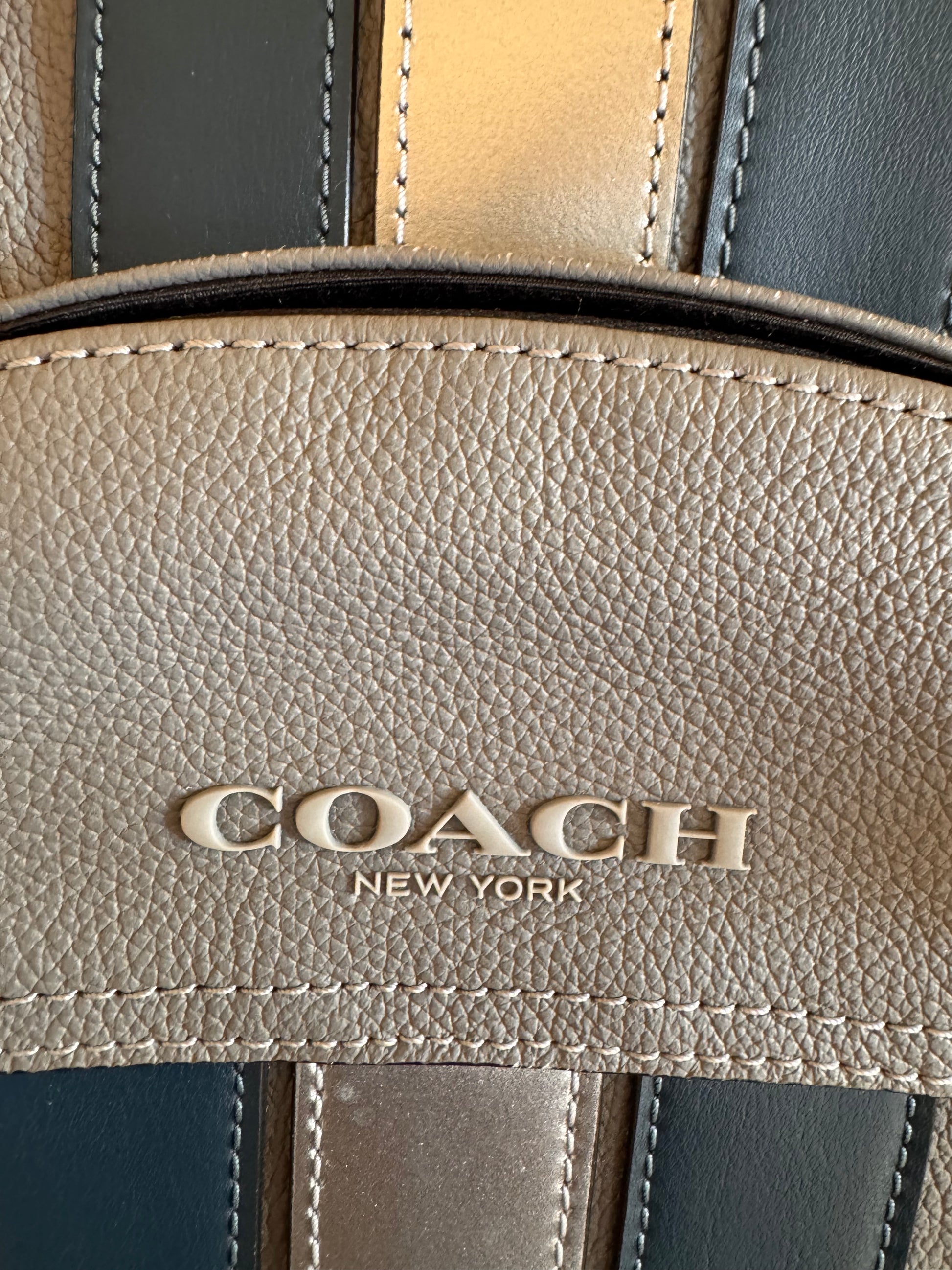 El diseño presenta un detalle de raya universitaria en una combinación de colores gris, blanco roto y azul.