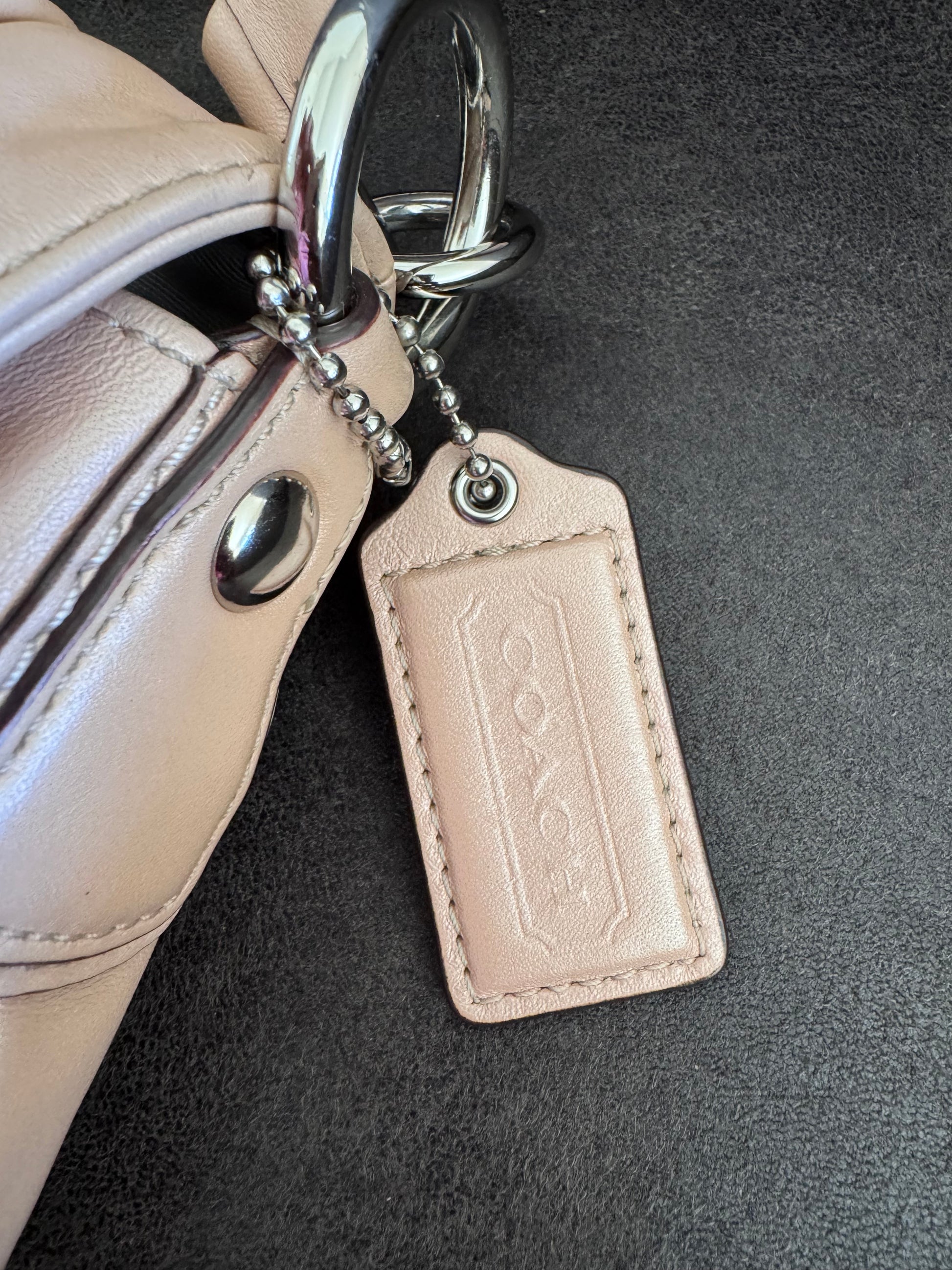 Material: El bolso está hecho de piel perlada y forrado con tela Coach personalizada.