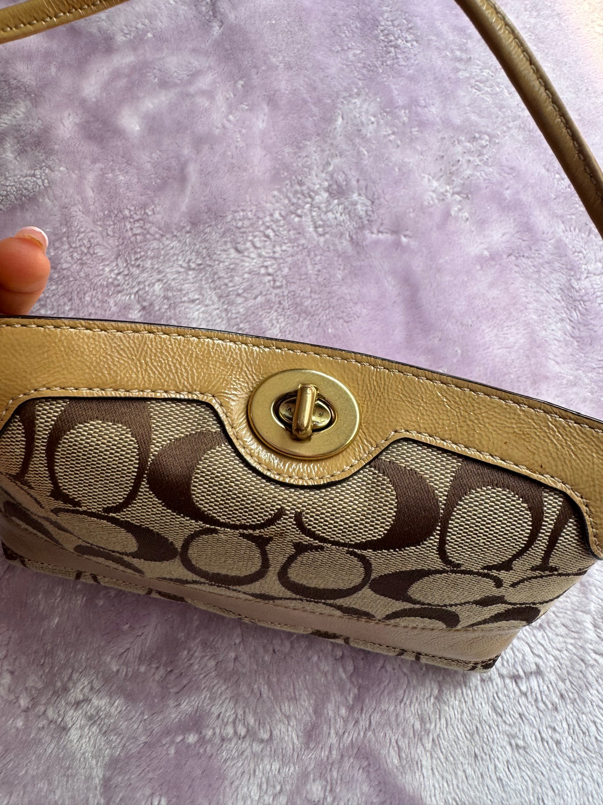 Wristlet de lona acentuada con detalles o ribetes de piel color beige, herrajes dorados incluye un charm con el emblema dorado "COACH EST. 1941", NO TAG.